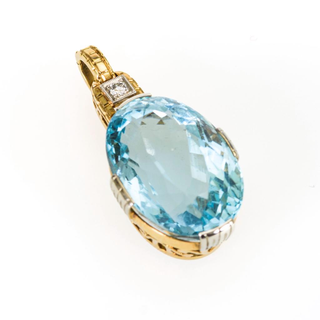 Krappengefasster Stein und kleiner Diamant auf durchbrochenem Unterbau. Bewegliche Klippöse.