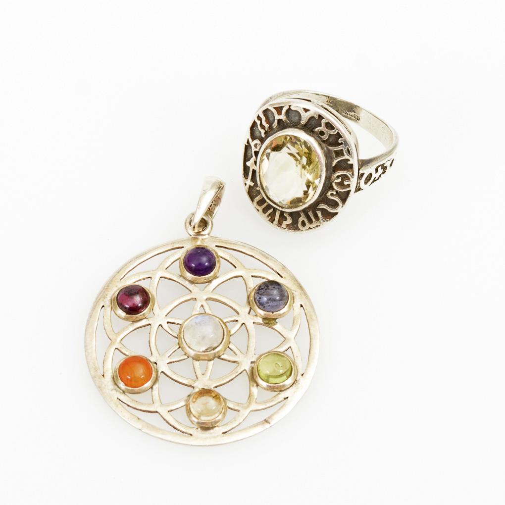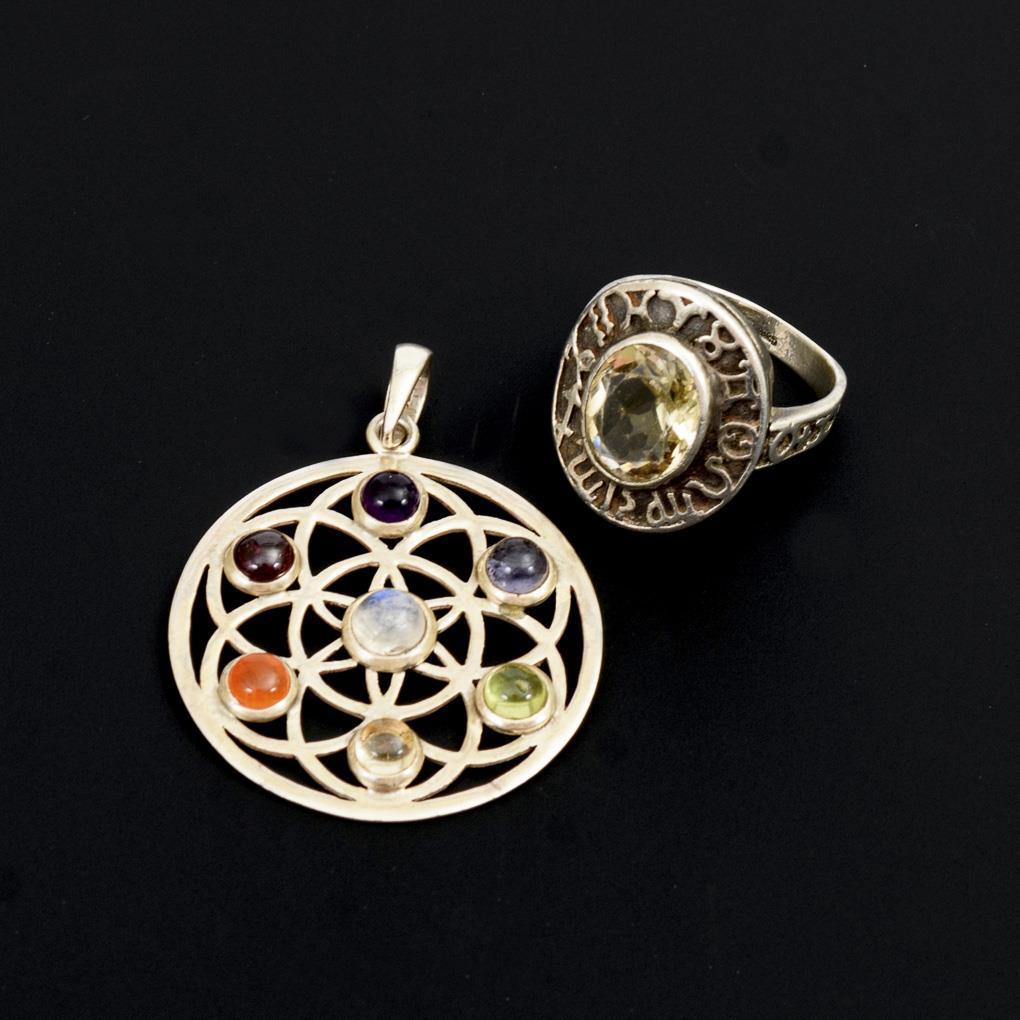 Chakra-Anhänger mit verschiedenen Steinen und Sternzeichen-Ring mit zargengefasstem Stein.