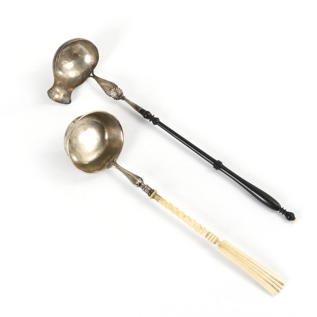 Bowlenkelle mit Holzgriff und Suppenkelle mit gedrehtem Beingiff. Alters- und Gebrauchsspuren.