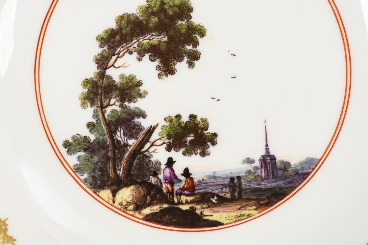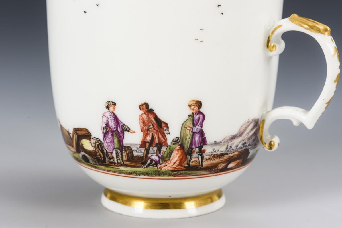 Gefußte Glockentasse mit Rocaillehenkel. Umlaufend auf der Tasse eine Küstenlandschaft mit Kaufleuten, Segelschiffen und Architektur, im Spiegel der Untertasse eine idyllische Landschaft mit Personenstaffage und Kapelle. Minimale Kratzer auf der Tasse (Mann links des Henkels) und der Untertasse (unter dem Baum).
