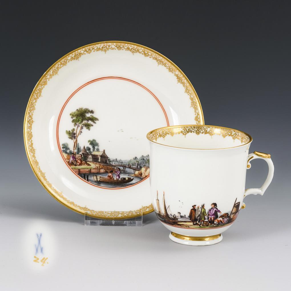 Gefußte Glockentasse mit Rocaillehenkel. Umlaufend auf der Tasse eine Küstenlandschaft mit Kaufleuten, Segelbooten und Architektur, dabei auf einer Kiste die Bezeichnung "St. I. 4 h. z.". Im Spiegel der Untertasse eine Flusslandschaft mit Personenstaffage, Holzgebäuden und Brücke.