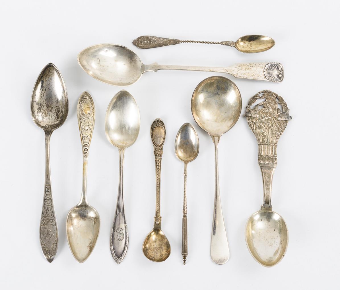 Verschiedene reliefierte Kaffee-, Mokka- und Sahnelöffel, darunter Jugendstil und 1 Jahreslöffel von 1924. Alters- und Gebrauchsspuren.
