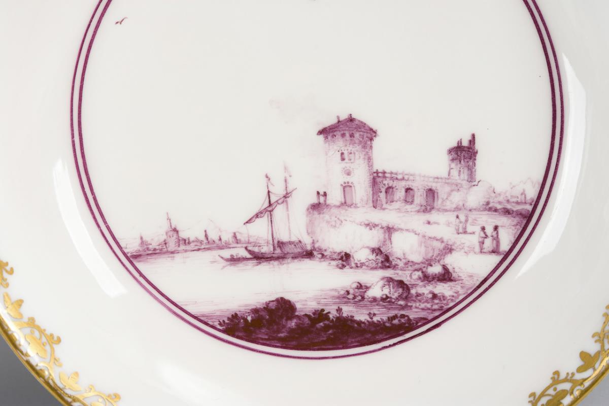 Auf dem Koppchen unter einer Goldbordüre die Darstellung einer Küstenlandschaft mit Waren, Kaufleuten und Schiffen, im Spiegel der Untertasse eine Küstenlandschaft mit Architektur.