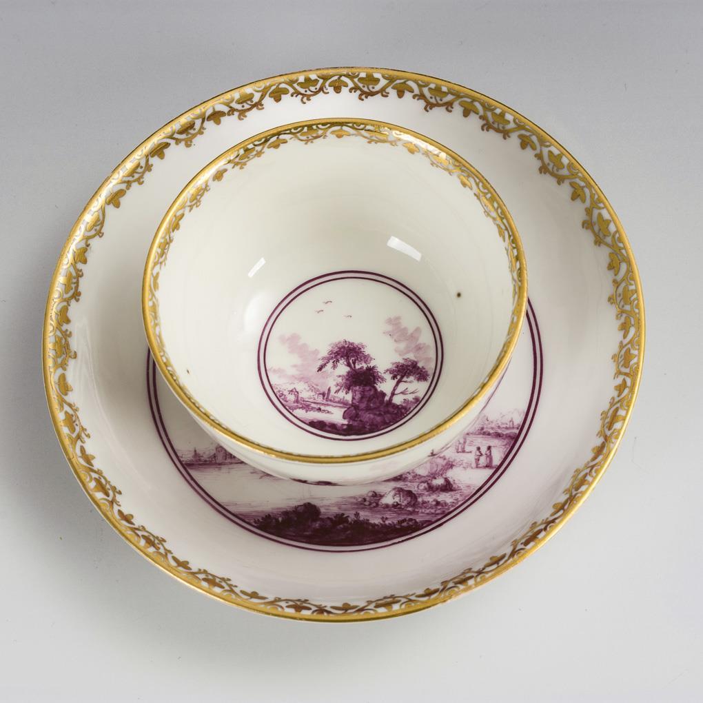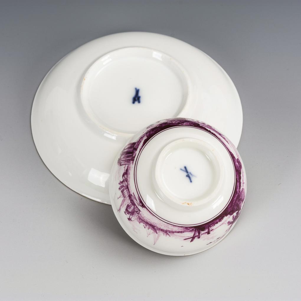 Purpurfarbene Malerei, Goldstaffage. H Koppchen 4,5 cm, Ø originale Untertasse 13 cm.