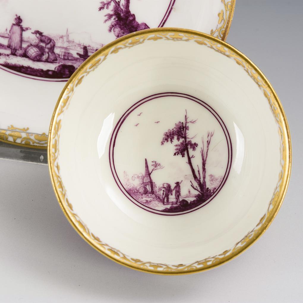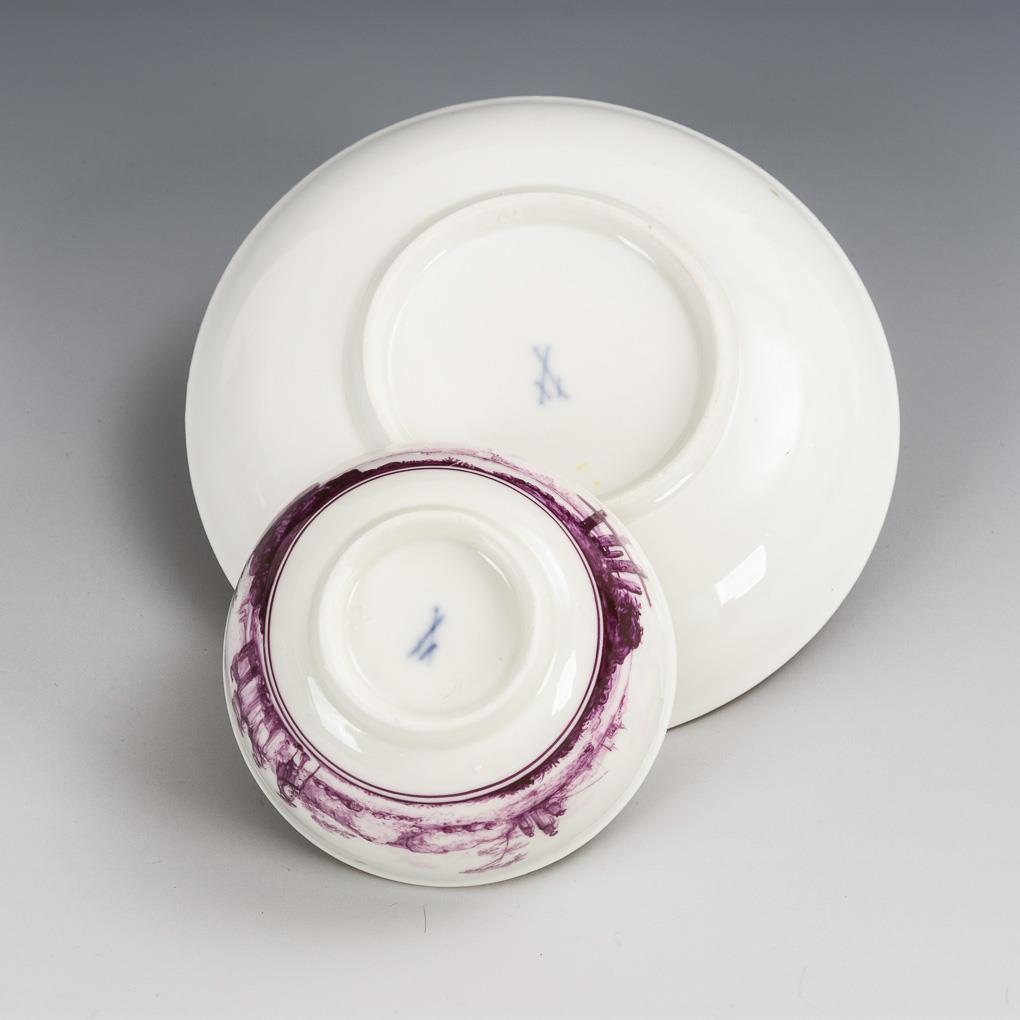 Purpurfarbene Malerei, Goldstaffage. H Koppchen 4,5 cm, Ø originale Untertasse 13,5 cm.
