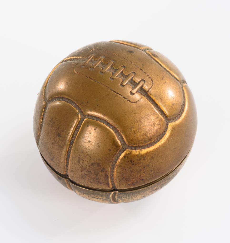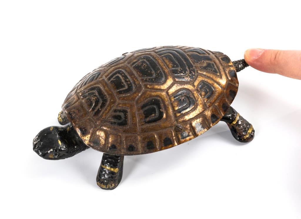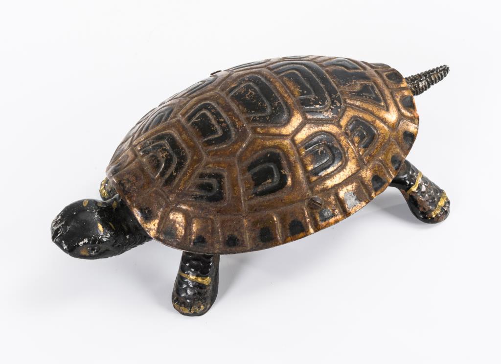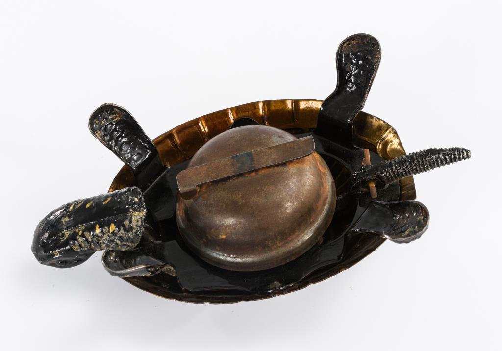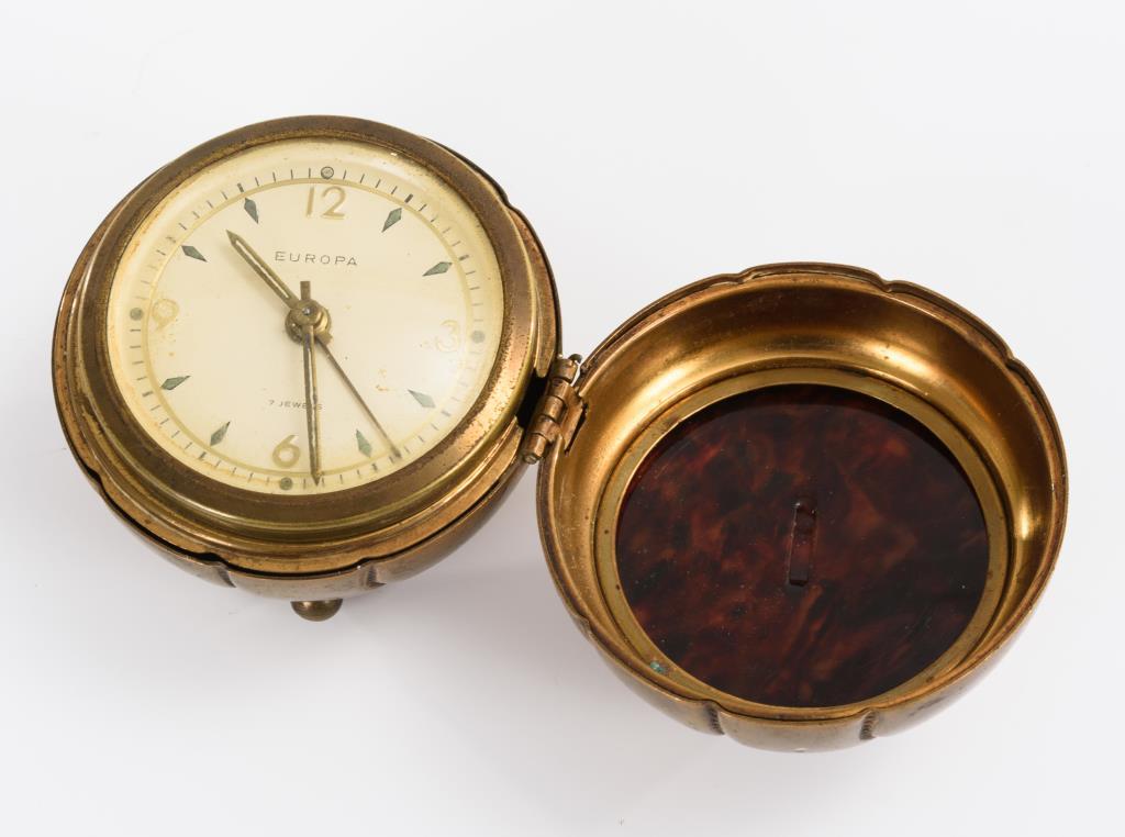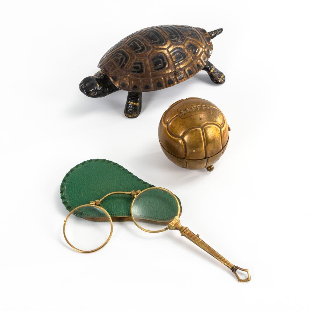 Tischklingel in Form einer Schildkröte (lackiertes Weißblech). Funktioniert. / Reisewecker in Fussballform (Messingblech) "Europa 7 Jewels" gemarkt. Läuft. / Goldfarbenes Lognon im grünen Lederetui. Teils berieben.