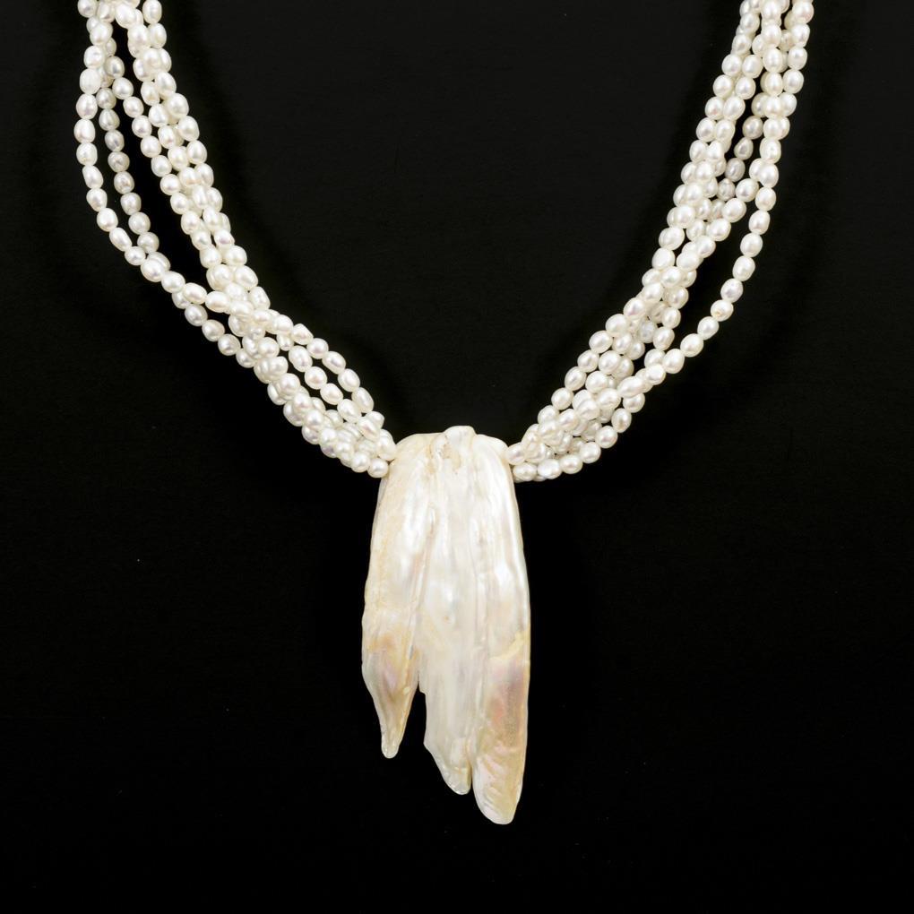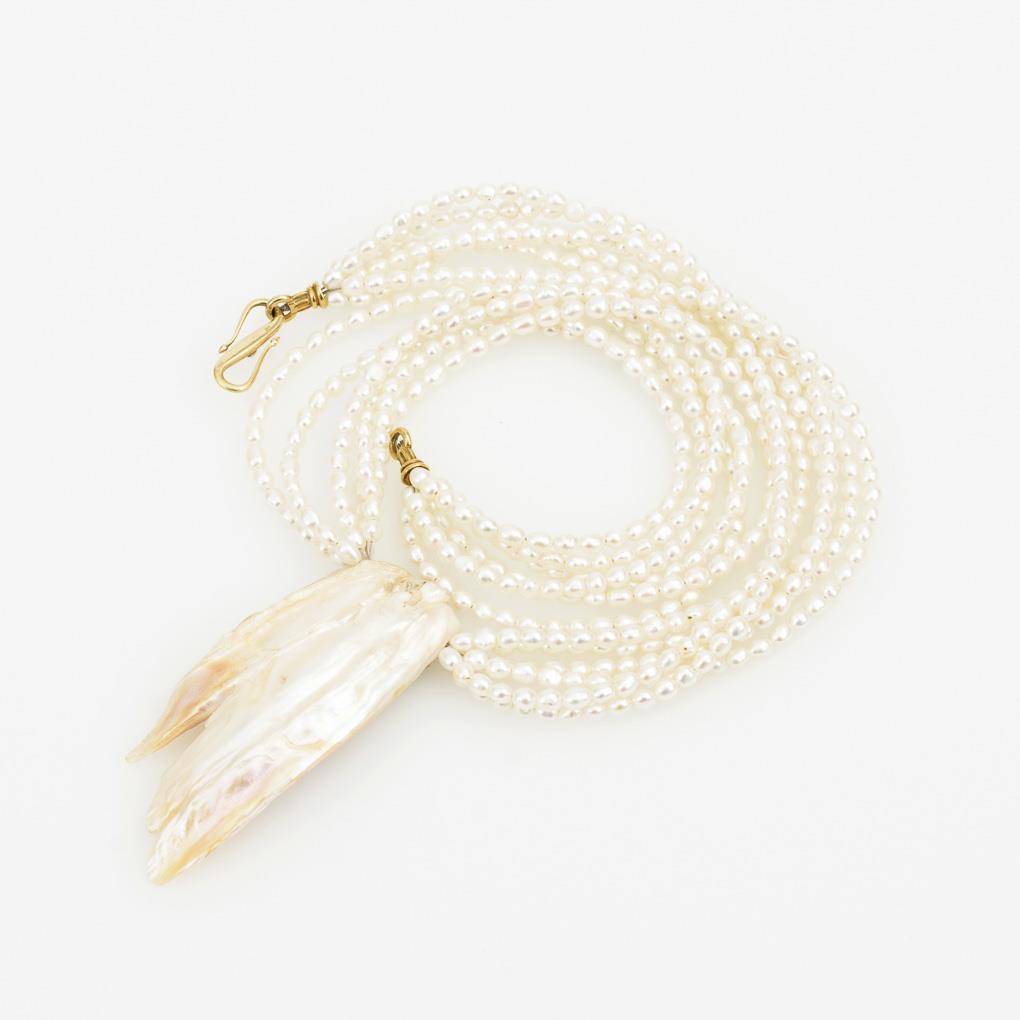 Schnürketten mit kleinen Zuchtperlen und Perlmuttstück, an Hakenverschluss.