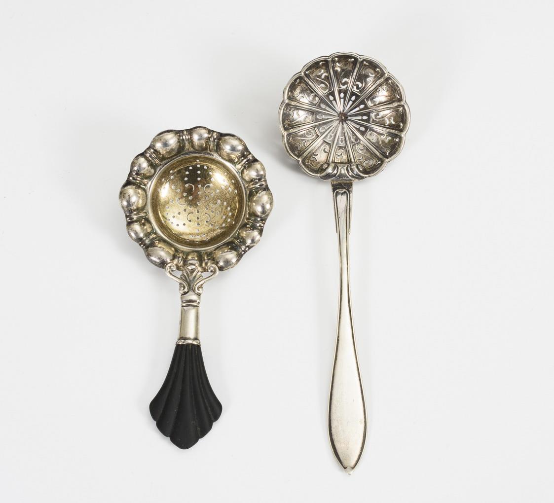 2 Schaumlöffel, 6 Untersetzer mit Kordelrand und kleines Ovaltablett. Gebrauchsspuren.