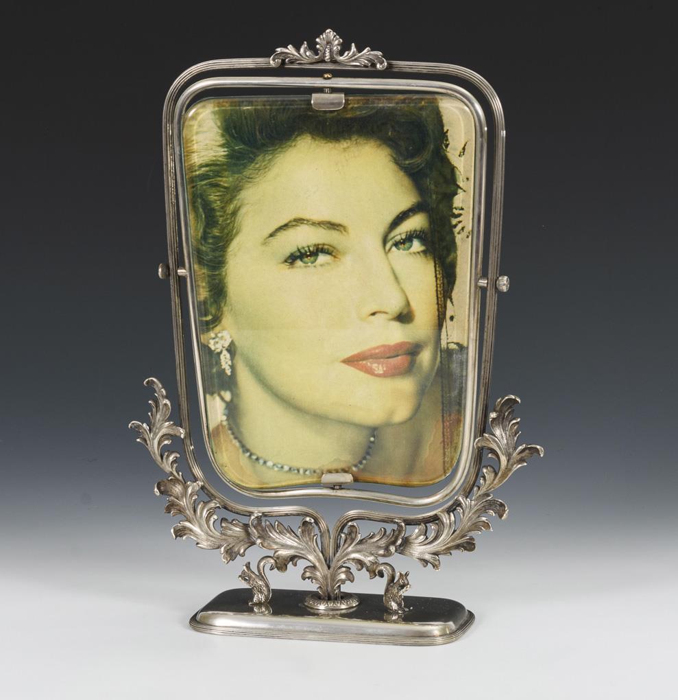 Reliefierte Spiegelhalterung mit Blattwerk und 2 Eichhörnchen. Spiegel in alle Richtungen schwenkbar, rückseitig mit Filmstar-Porträt (wohl Sophia Loren). Spiegelglas mit Blindstellen, Bild leicht wellig.