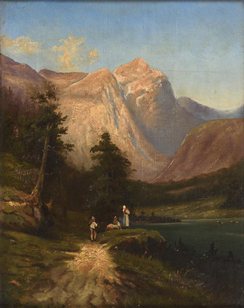 Staffagefiguren am Alpensee unter blauem Himmel. Leichte Altersspuren.