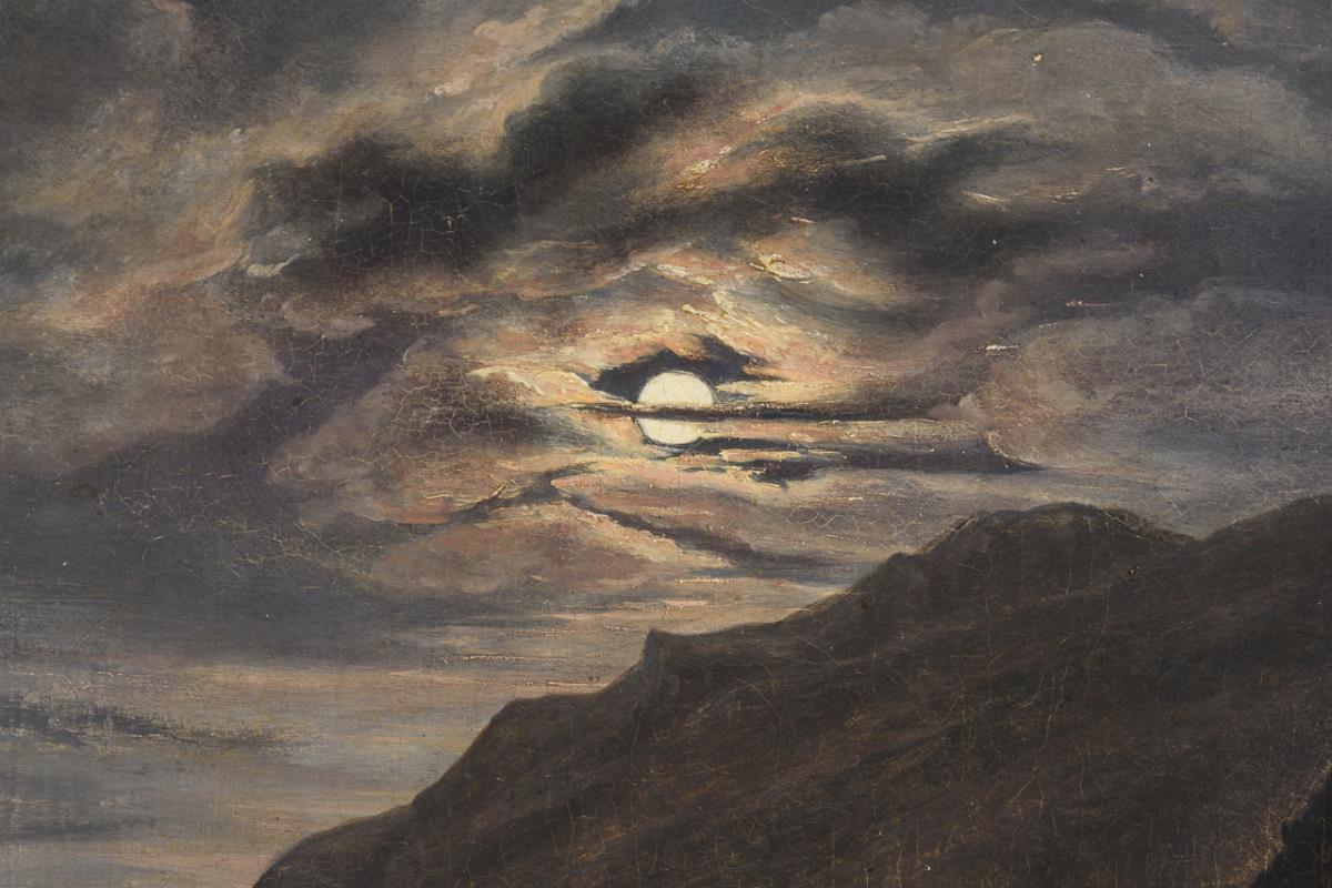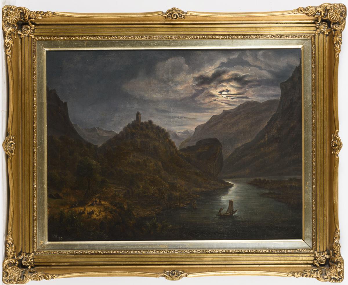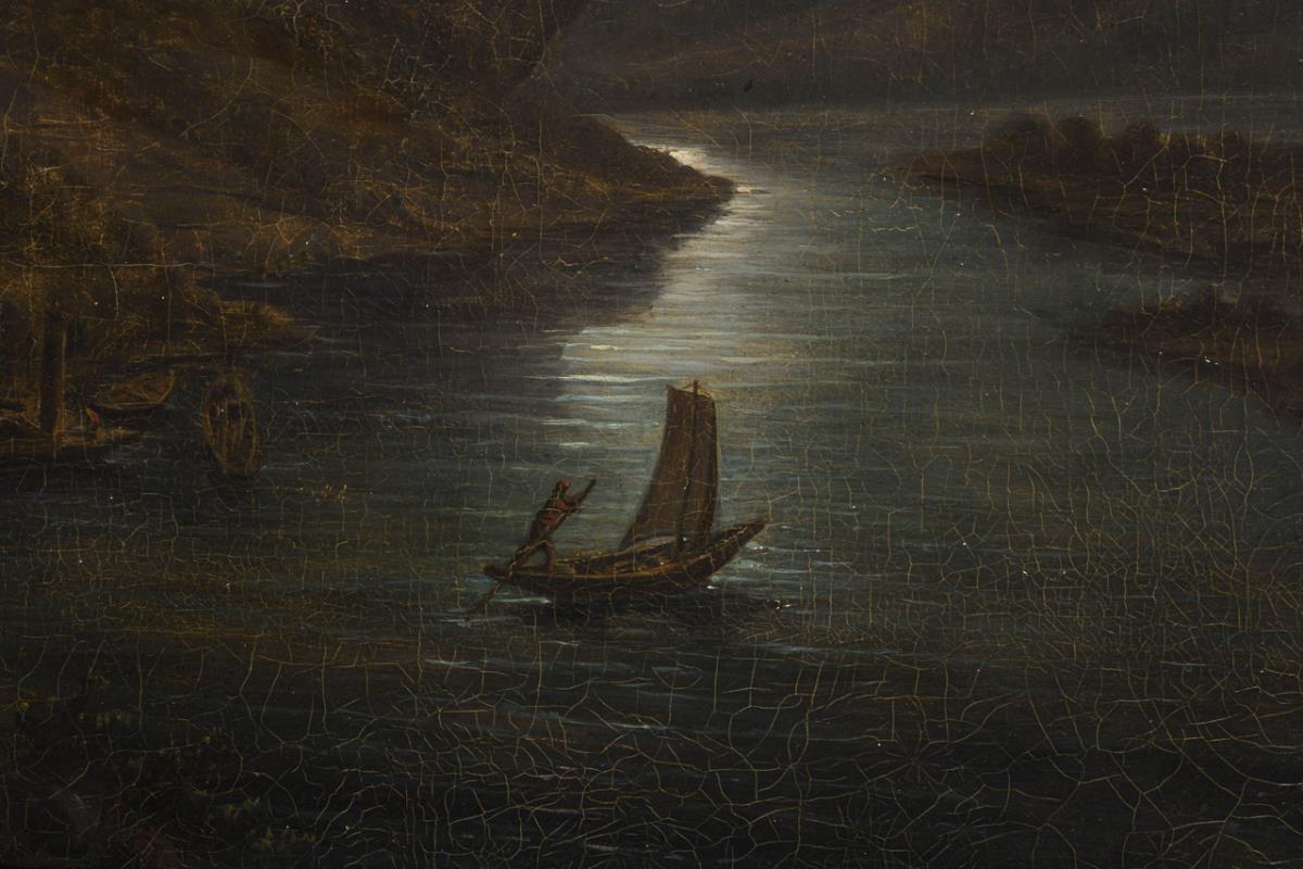 Helles Vollmondlicht über dem Flusslauf zwischen den hohen Bergen mit Staffage am Ufer. Eine kleine restaurierte Stelle mit Hinterklebung.