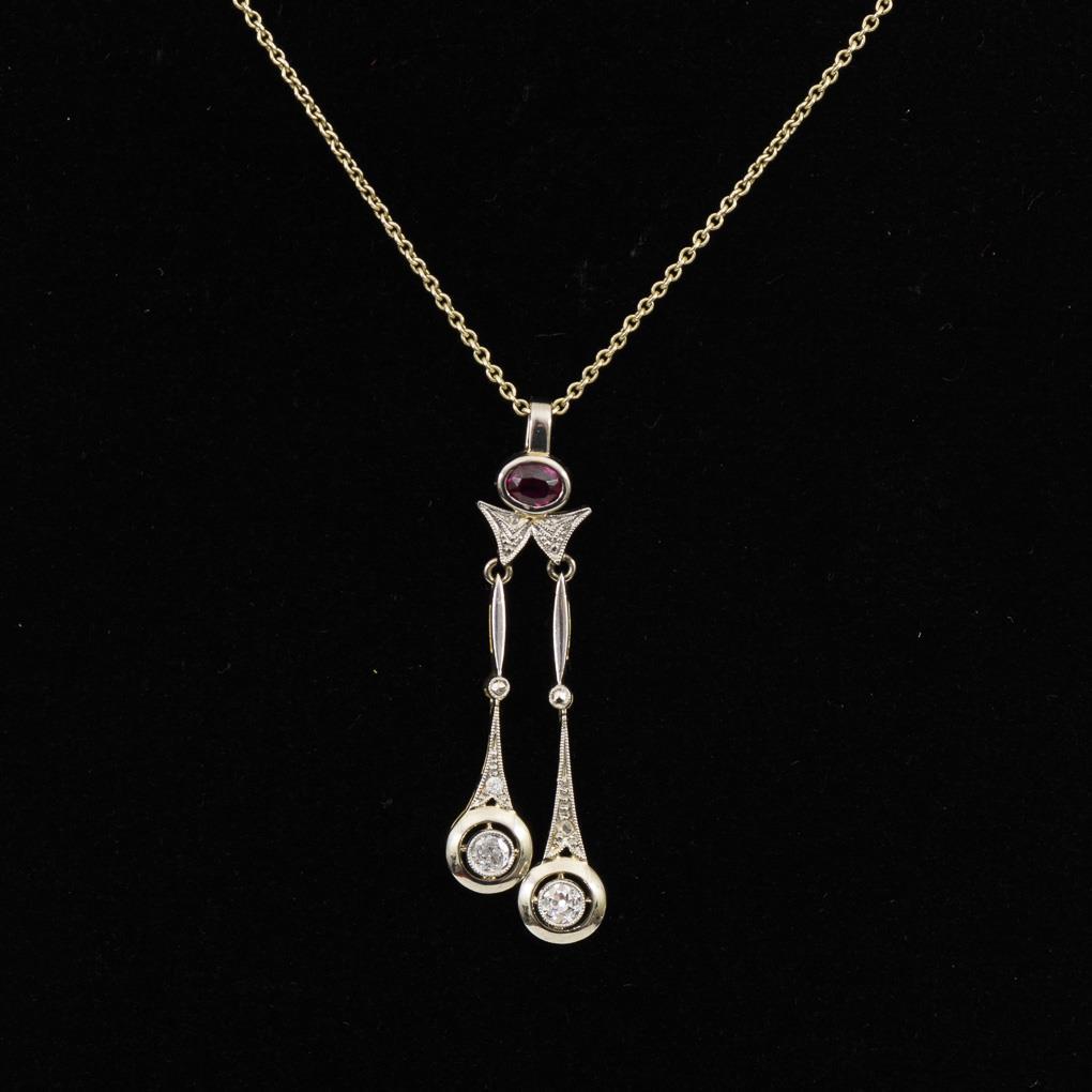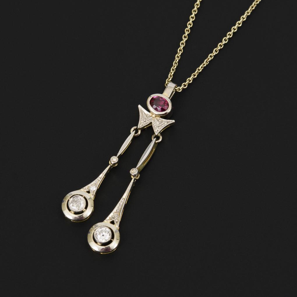 Art-déco-Anhänger mit Altschliff-Brillanten, Rubin und Diamantrosen.