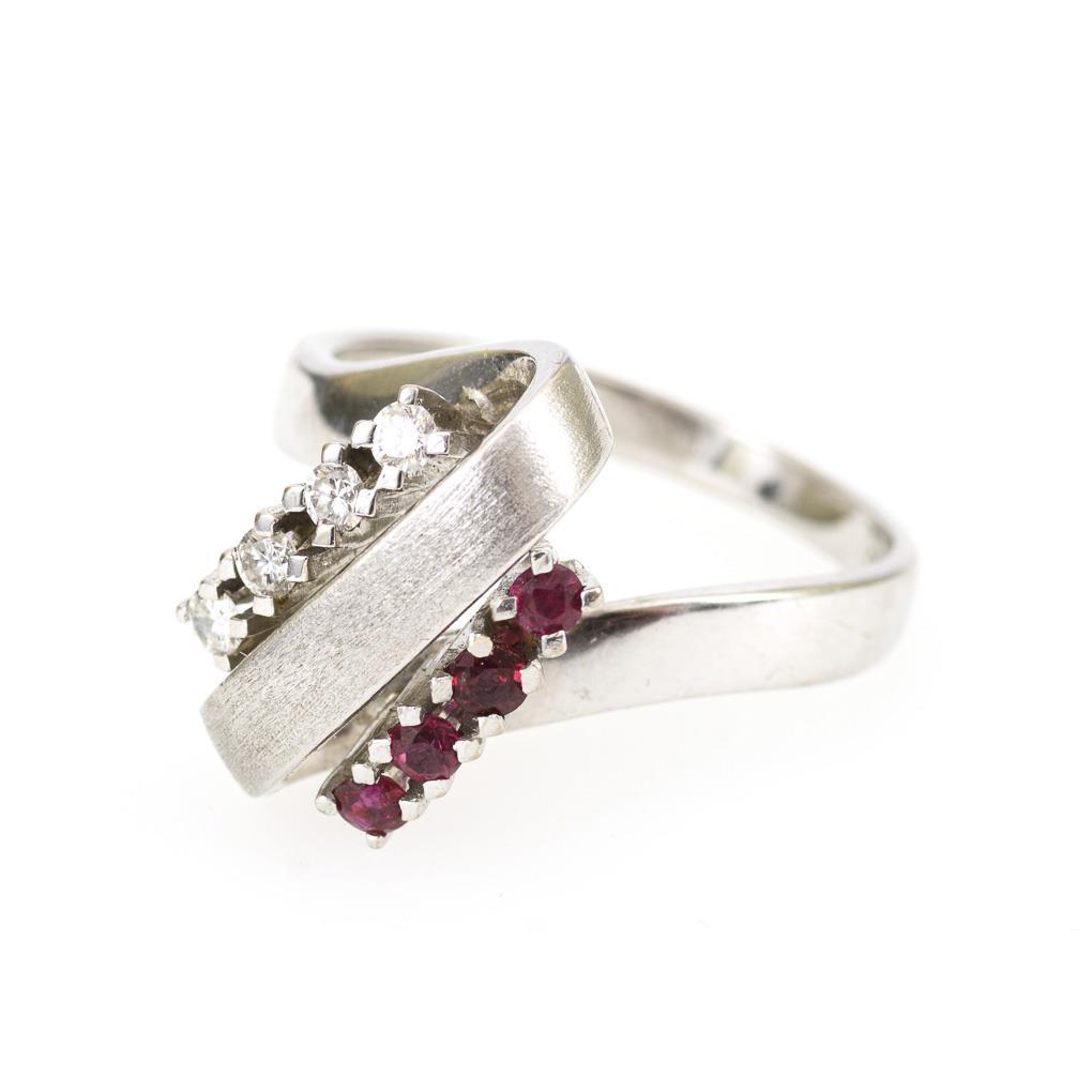 4 erhöht chatongefasste Brillanten und Rubine auf mittlerer Schiene.