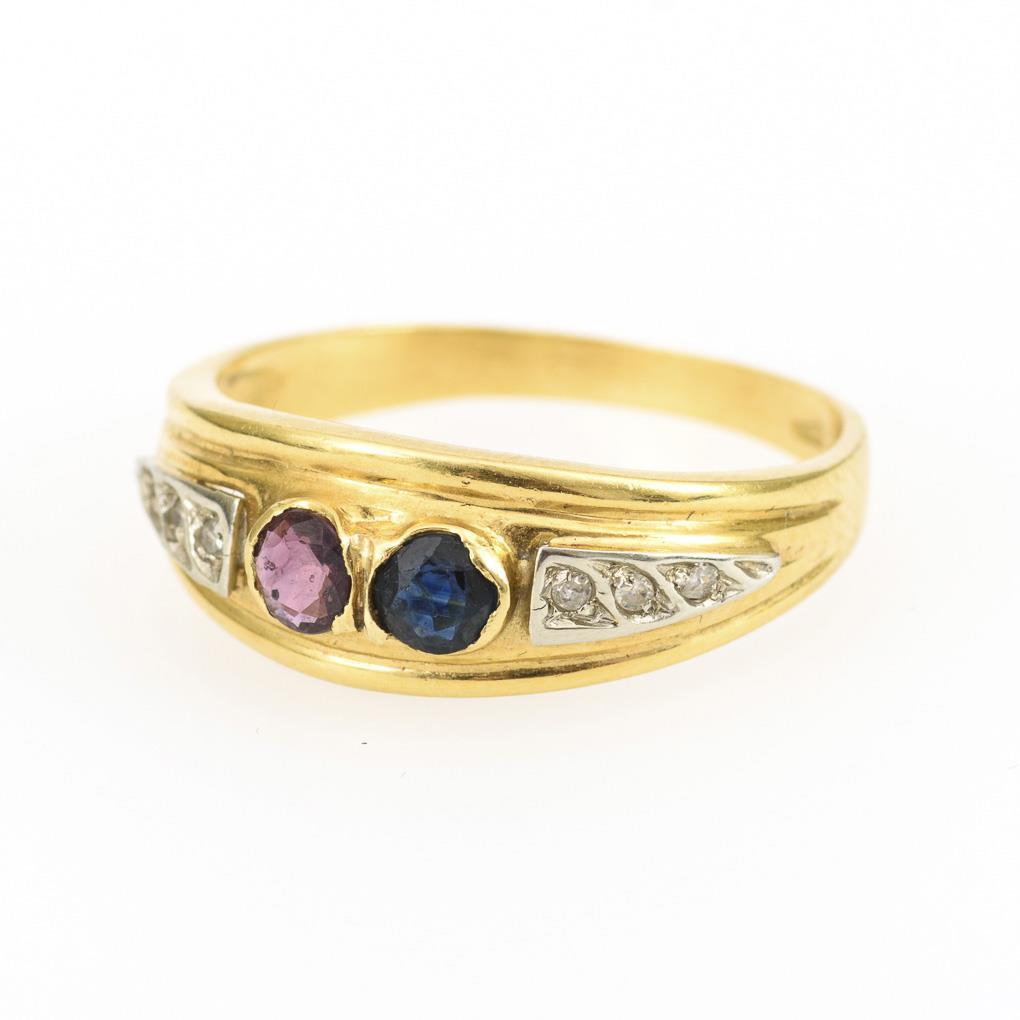 Gefasster Saphir, Rubin und 6 kleine, eingelassene Diamanten, zwischen schmaler Schiene. Zargenfassungen etwas gedellt.
