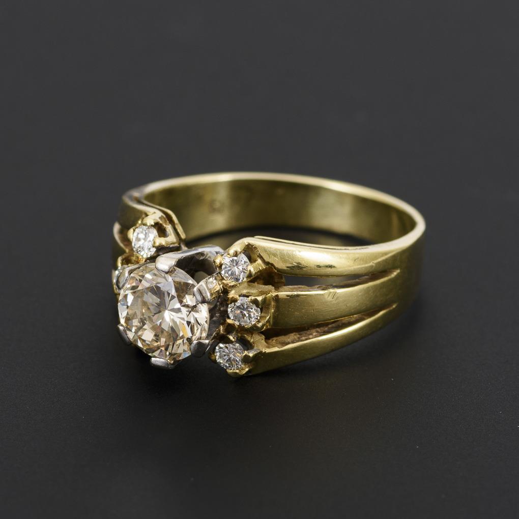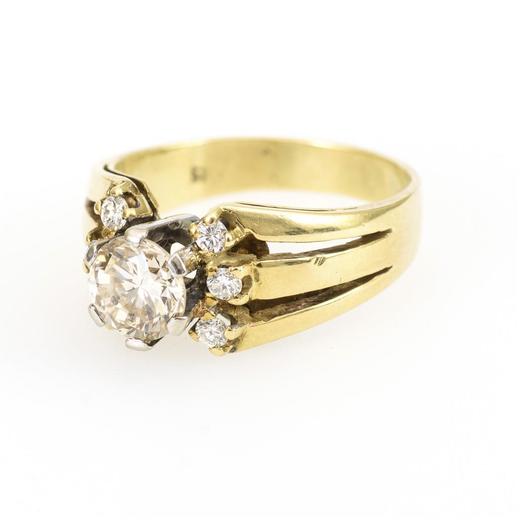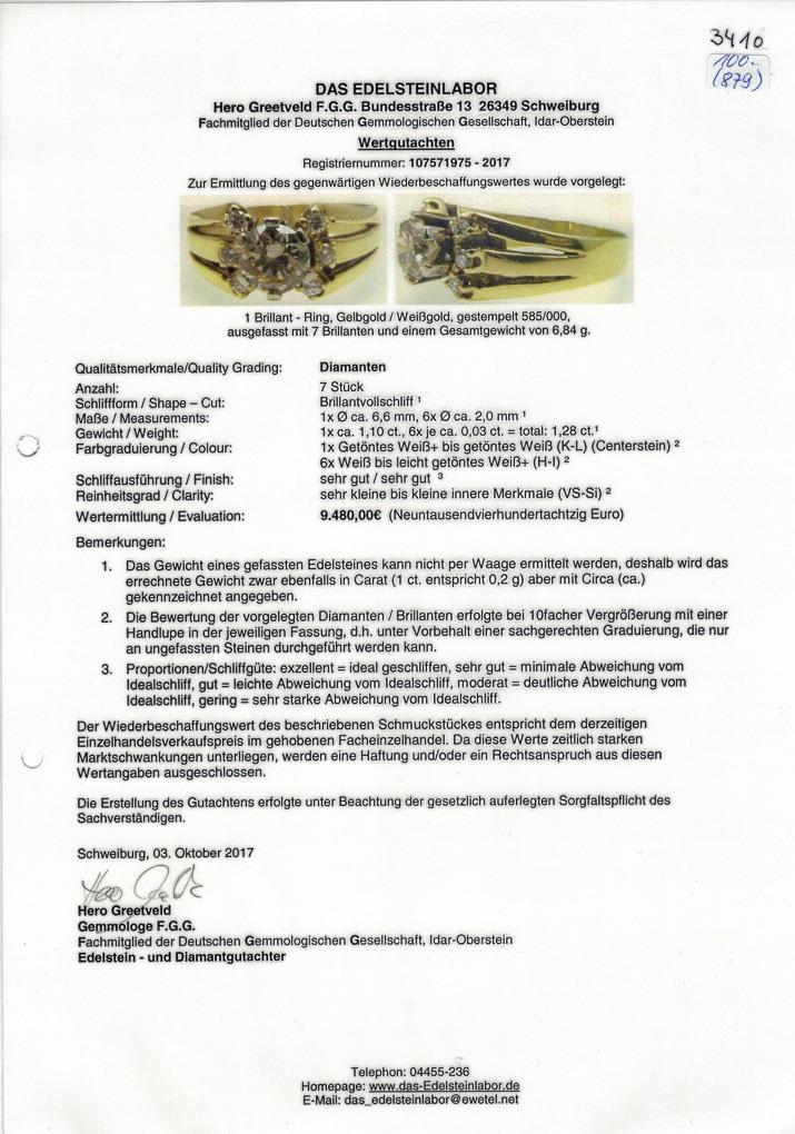 Gelbgold/Weißgold 585 gestempelt. Brillant ca. 1,10 ct/getöntes Weiß/vs-si, 6 Brillanten zus. ca. 0,18 ct/Weiß bis leicht getöntes Weiß. Ringgröße 59 Ringgröße. 6,84 g.
