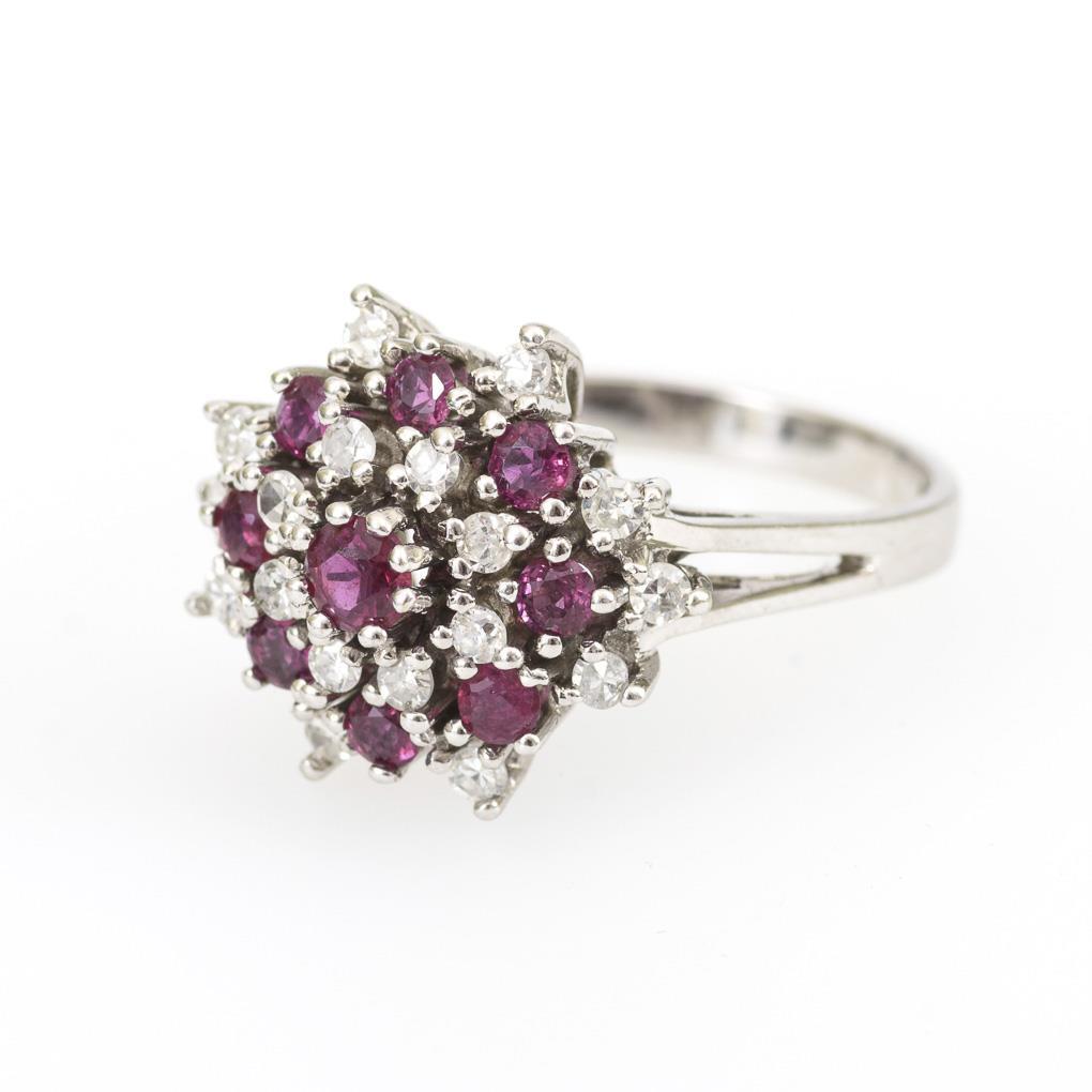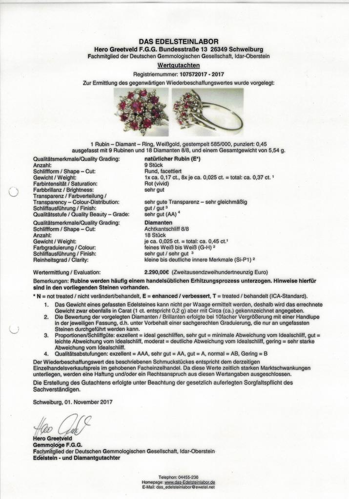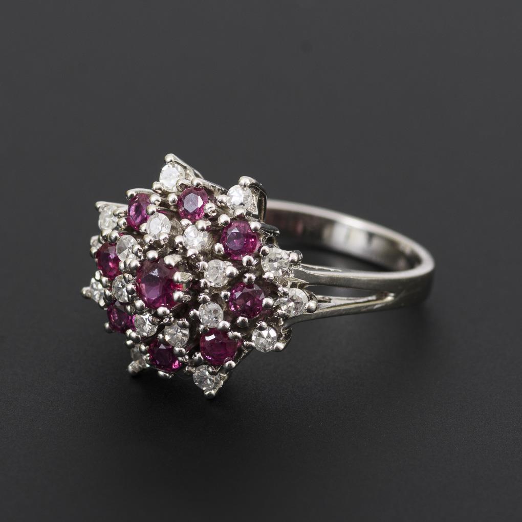 Weißgold 585 gestempelt. Rubine gesamt ca. 0,37 ct. Diamanten gesamt ca. 0,45 ct/G-H/si-PI. 5,54 g.