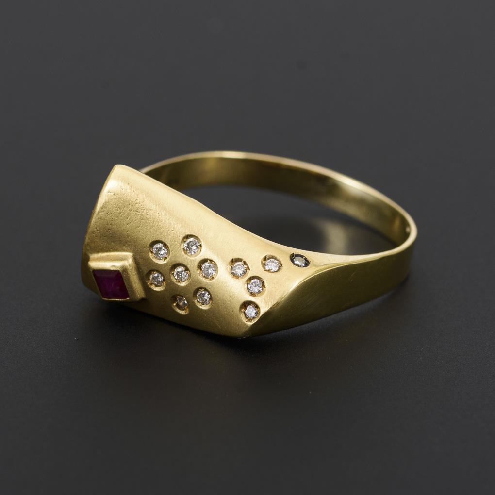 Satinierter Ringkopf mit Rubincarré und 12 kleinen, eingelassenen Brillanten. Mittlere Schiene.