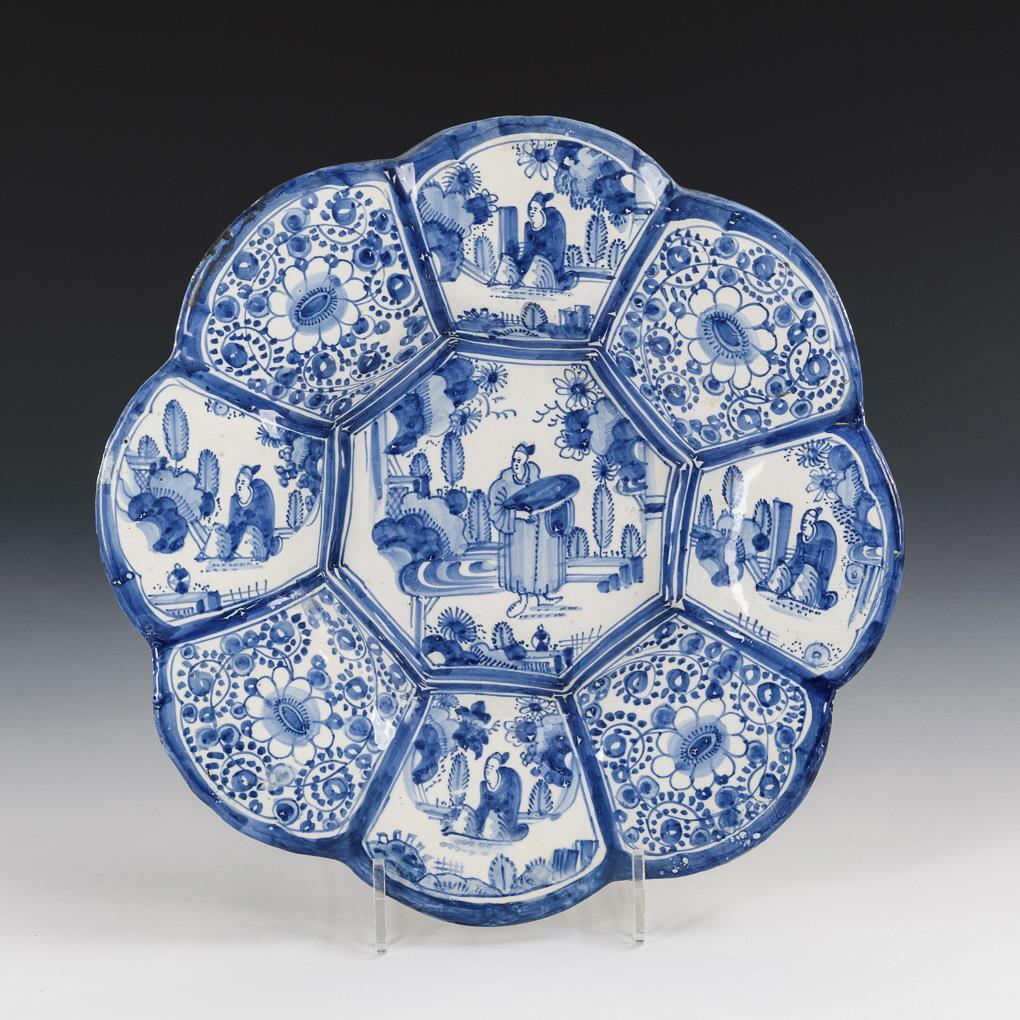 Runder Teller mit 8-fach gebuckeltem Rand, asiatisierenden Figurendarstellungen und Blumenmalerei. Restauriert, Haarriss am Rand, partiell leichte Bestoßungen.