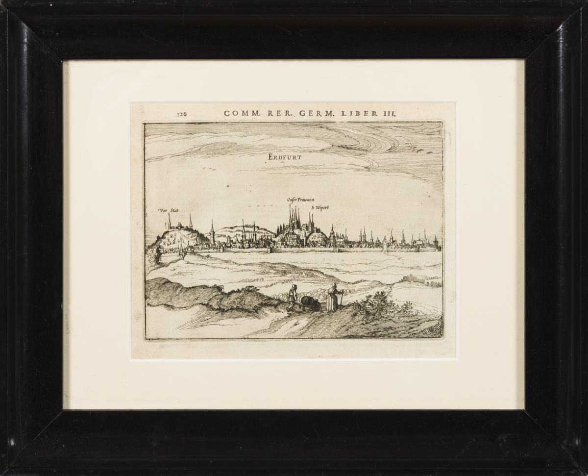 Zentralperspektivische Ansicht von Erfurt, bezeichnet "Erdfurt", aus dem topografischen Werk mit zahlreichen Ansichten europäischer Städte "Commentariorum Rerum Germanicarum libri tres", 1616 - 1632. Etwas fleckig.