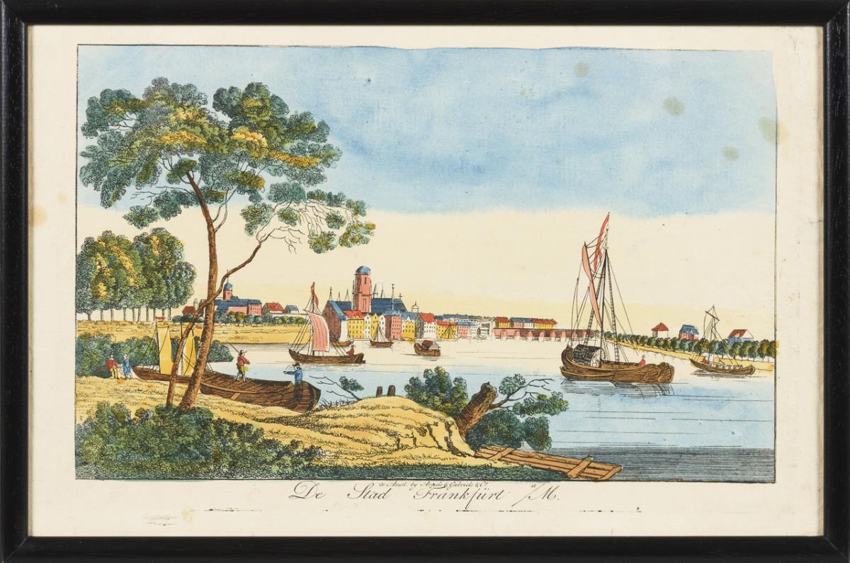 Ansicht des Mainufers mit Alter Brücke, bezeichnet "De Stad Frankfürt a/M", Arpelis & Gabriels & Co. Etwas stockfleckig, knickspurig.