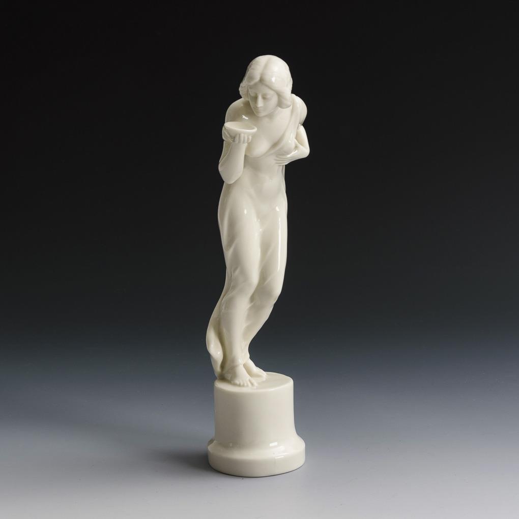 Auf einem Postament stehende, aus einer Schale trinkende junge Frau.