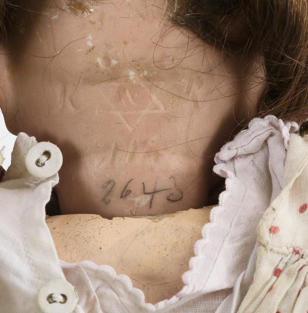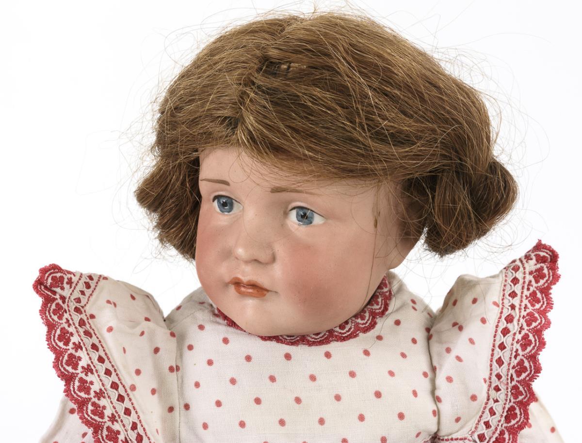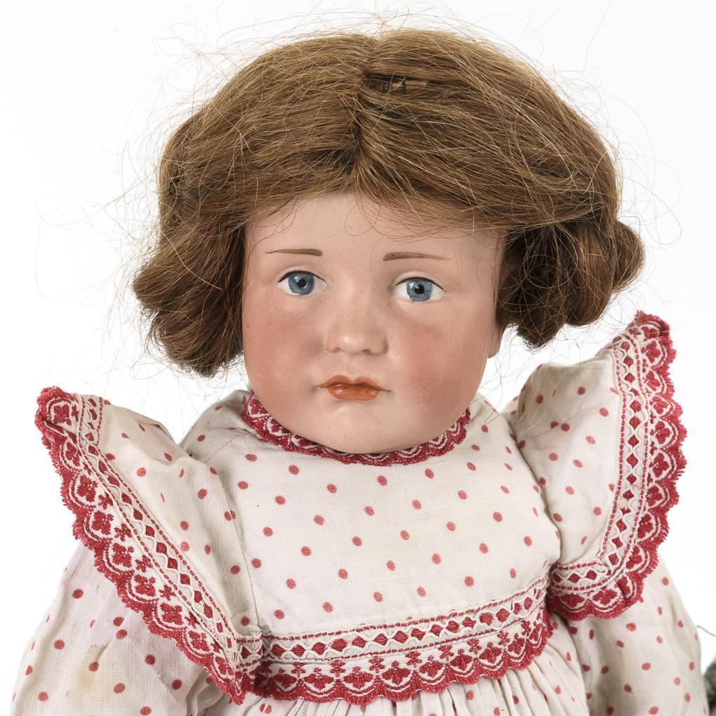 Kurbelkopf, gemalte blaue Augen, braune Echthaarperücke. 15-teiliger Gliederkörper. Weißes Kleid mit roten Pünktchen, schwarze Strümpfe. Dazu 7 Teile Kleidung. Kopf geklebt (war entlang der seitlichen Nähte in 2 Hälften zerbrochen). Körper mit kleinen Farbdefekten, 2 kleine Finger fehlen, linker Fuß bestoßen.