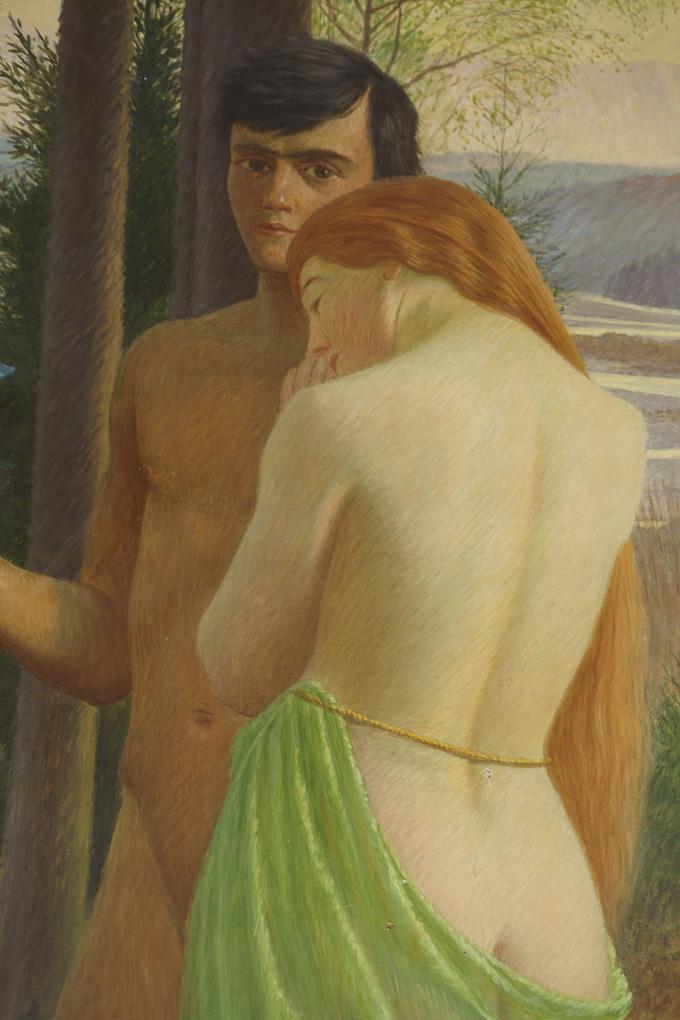 Sitzender weiblicher Akt am Ufer des Isartals mit einem Korb voller Blumen, daneben ein Paar mit Kleinkind und ein nackter, Flöte spielender Knabe. Leichte Altersspuren.