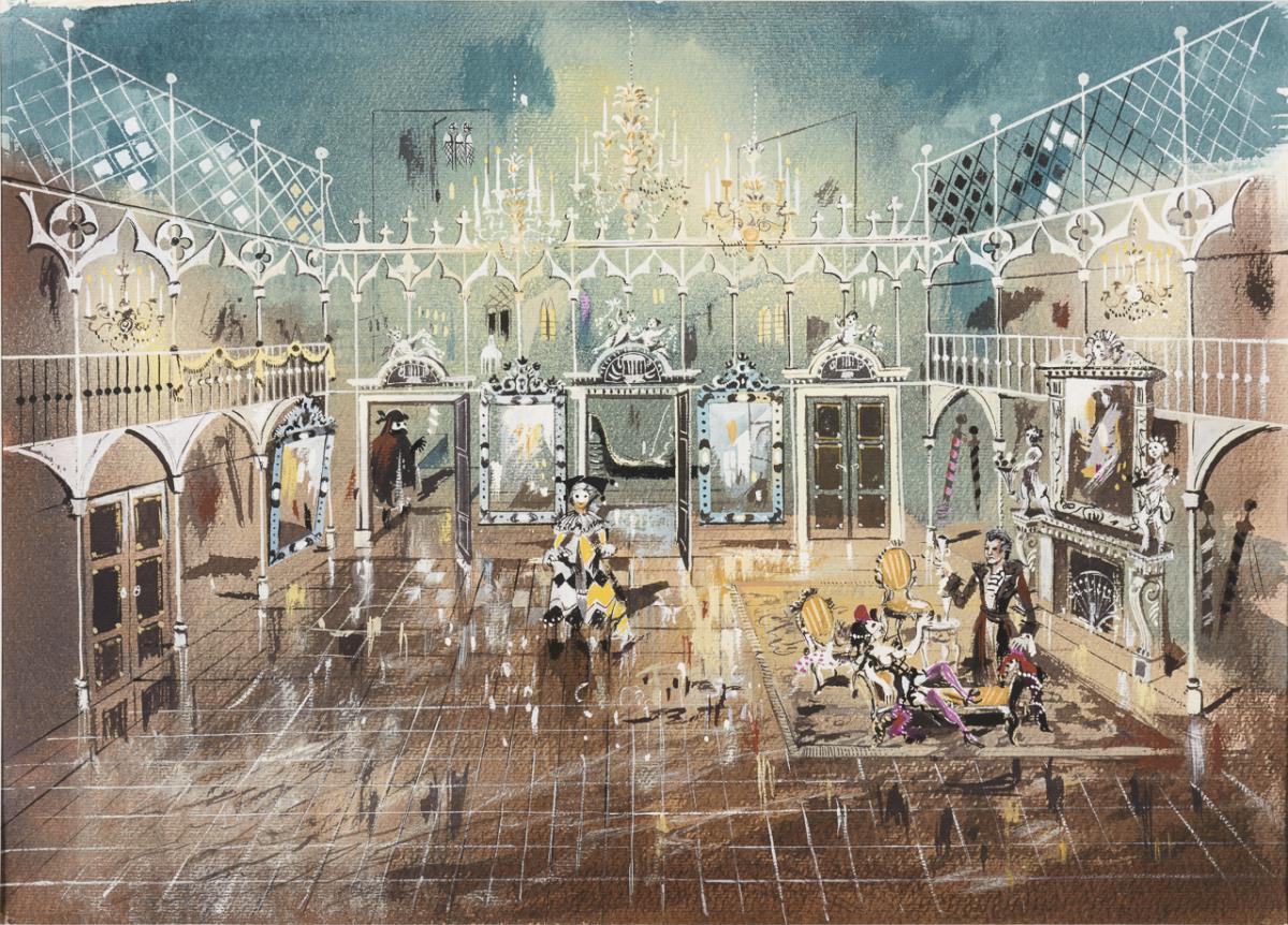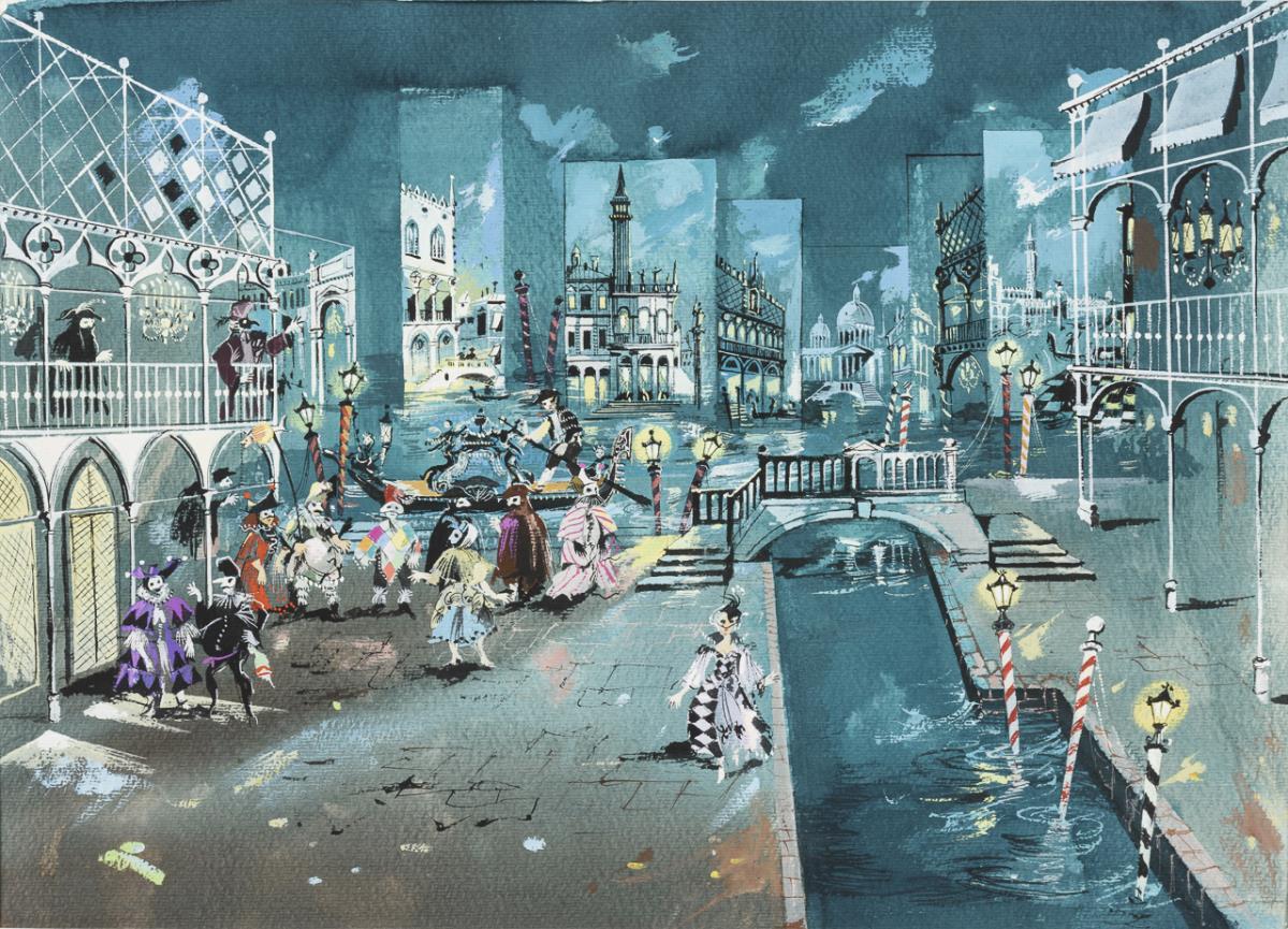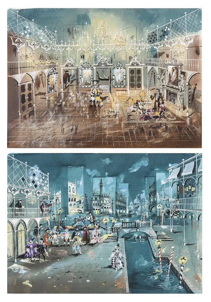 Zwei Darstellungen von kostümierten Personen am Kanal und in einem festlichen Saal.