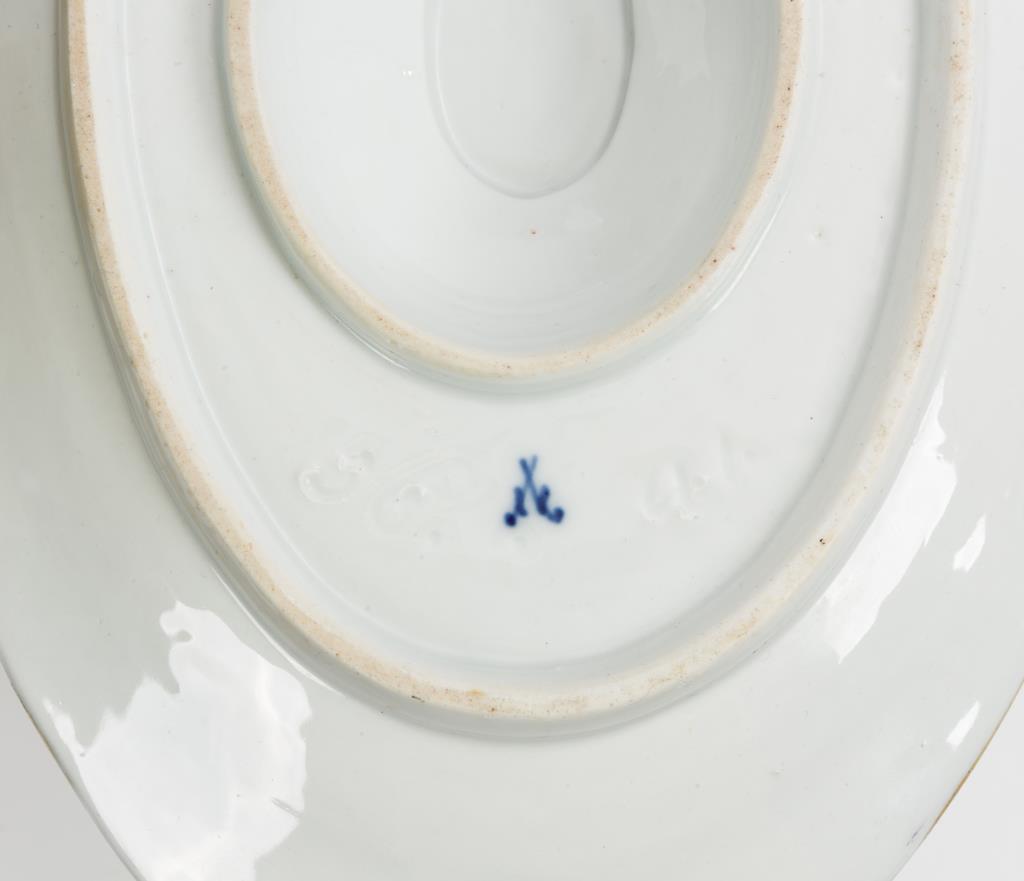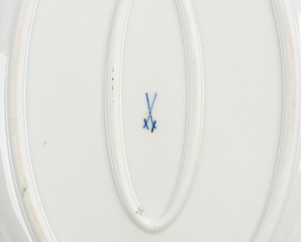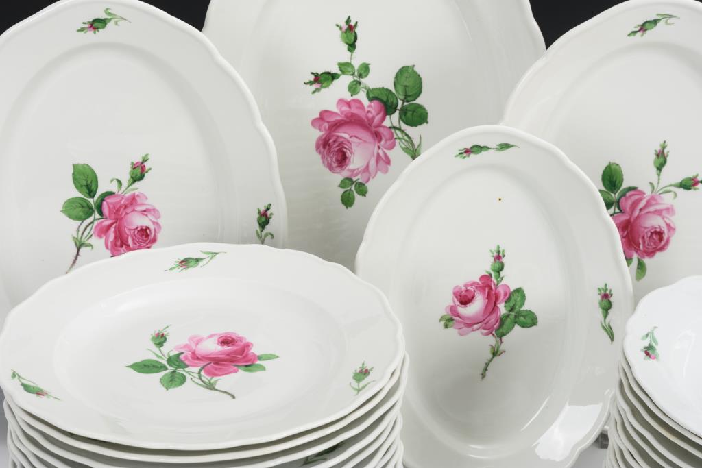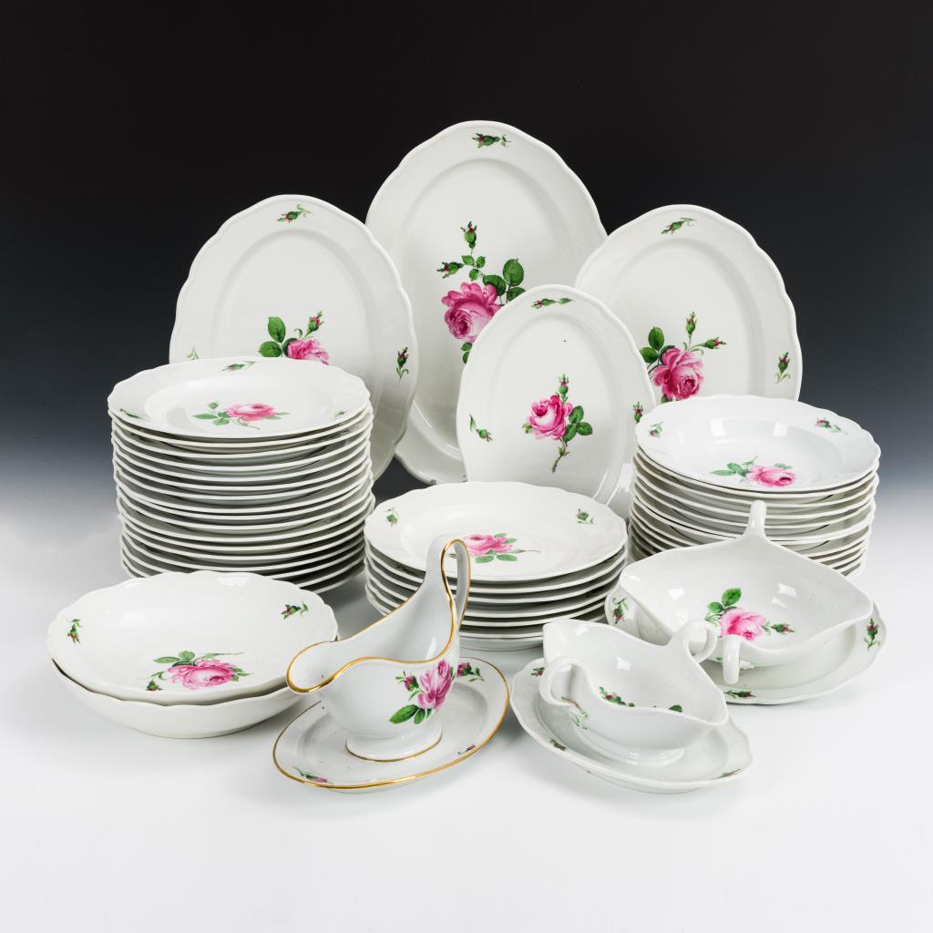 Form "Neuer Ausschnitt". 24 Speiseteller, 13 Suppenteller, 4 Ovalplatten (L 1x 41 cm, 2x 34,5 cm und 1x 28,5 cm), 2 Saucieren, 2 Schalen . Kleine Bestoßung an 1 Speisetellerrand.