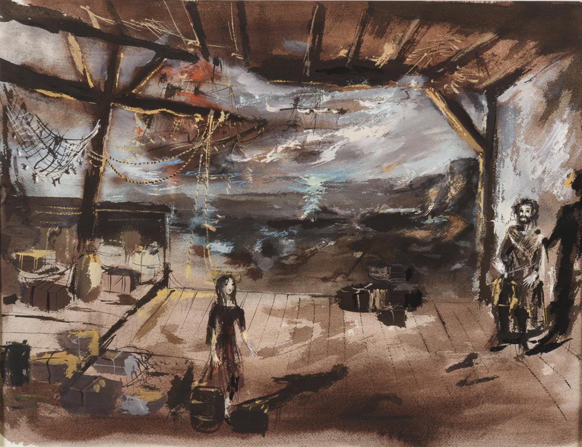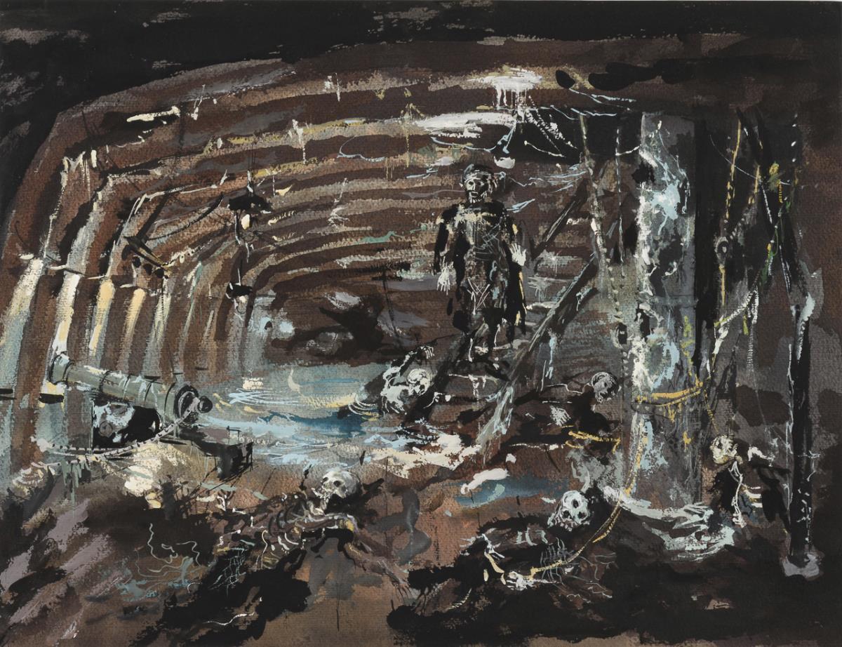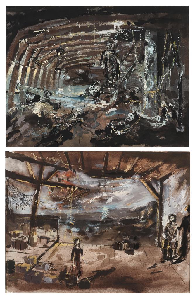 Zwei düstere Darstellungen mit Skeletten im Bauch eines Schiffes sowie zwei Personen am Meer.
