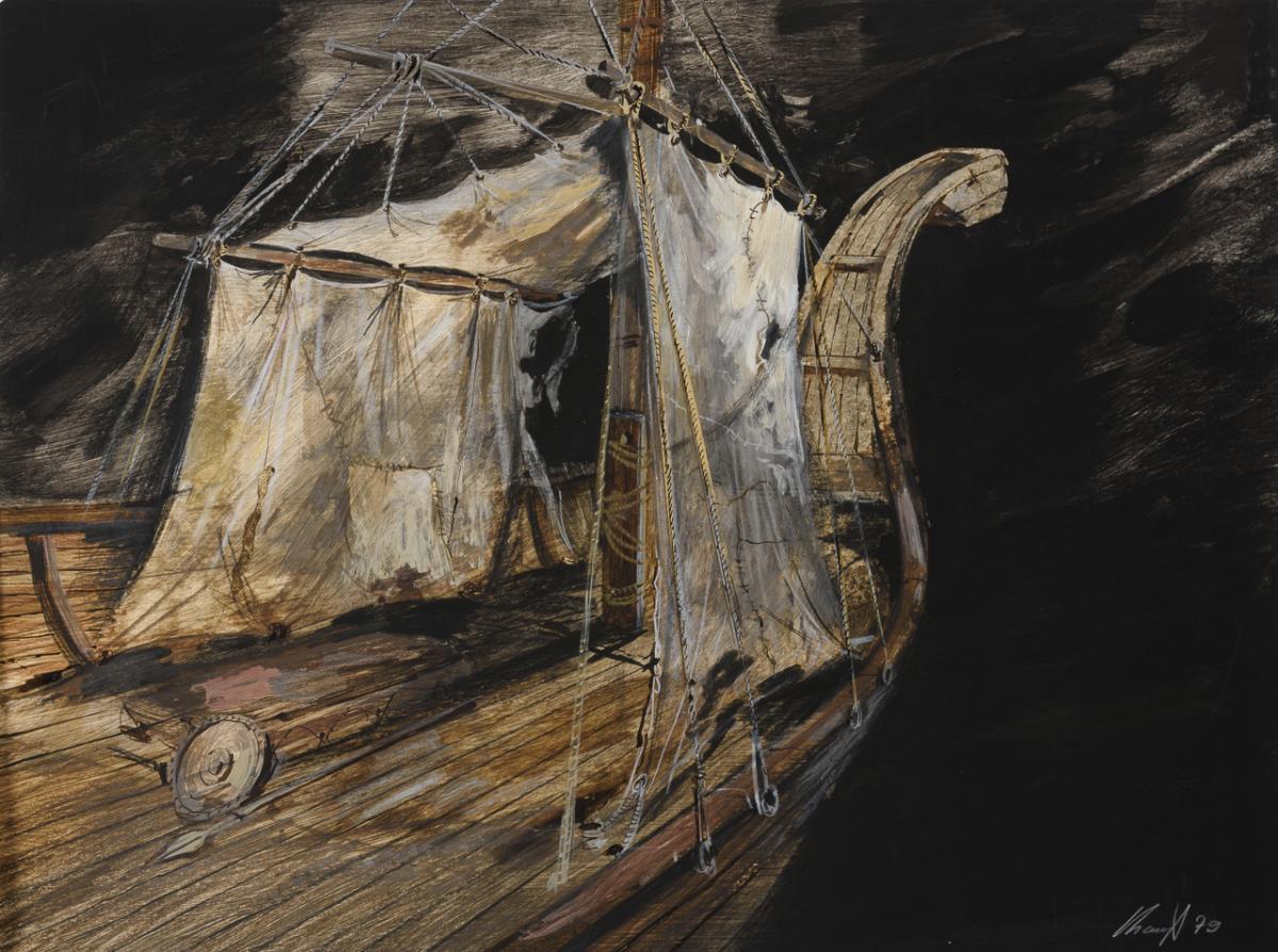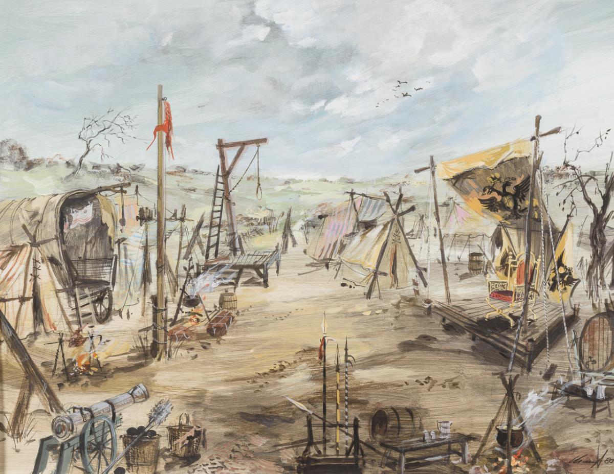 Leeres Militärlager als Bühnenbild zu "Katharina und Potemkin" sowie Entwurf eines Schiffs zu "Amphitryon".