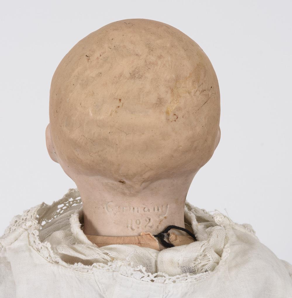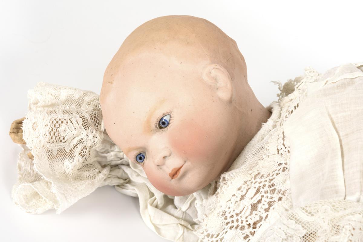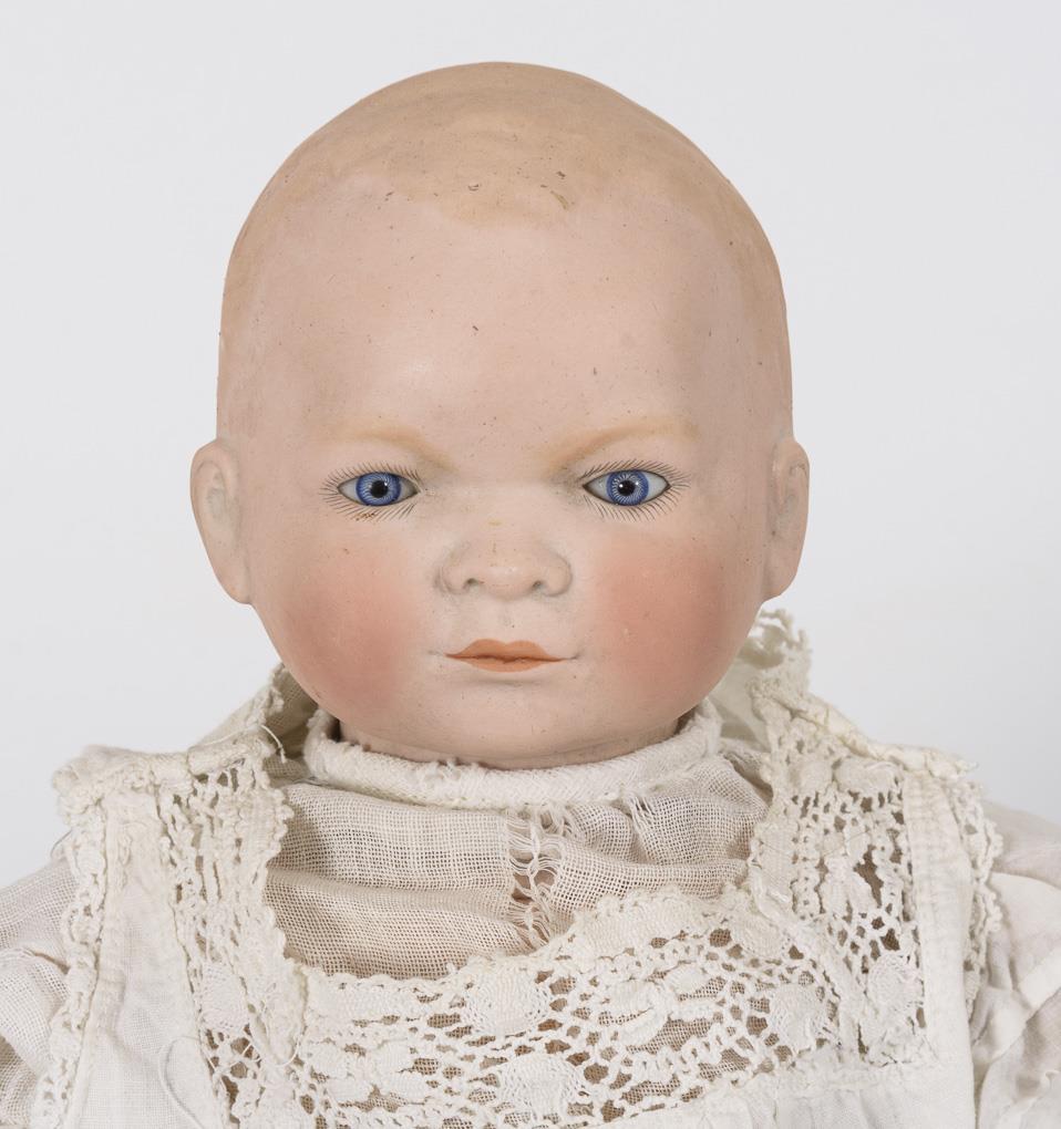 In Art der Dream-Babys: Einbindekopf, feste blaue Glasaugen, modellierter Haarboden. Stoffkörper mit verstummter Stimme. Weißes Kleid. 1 minimaler Chip am vorderen Halsfalz.