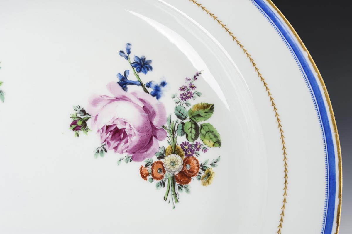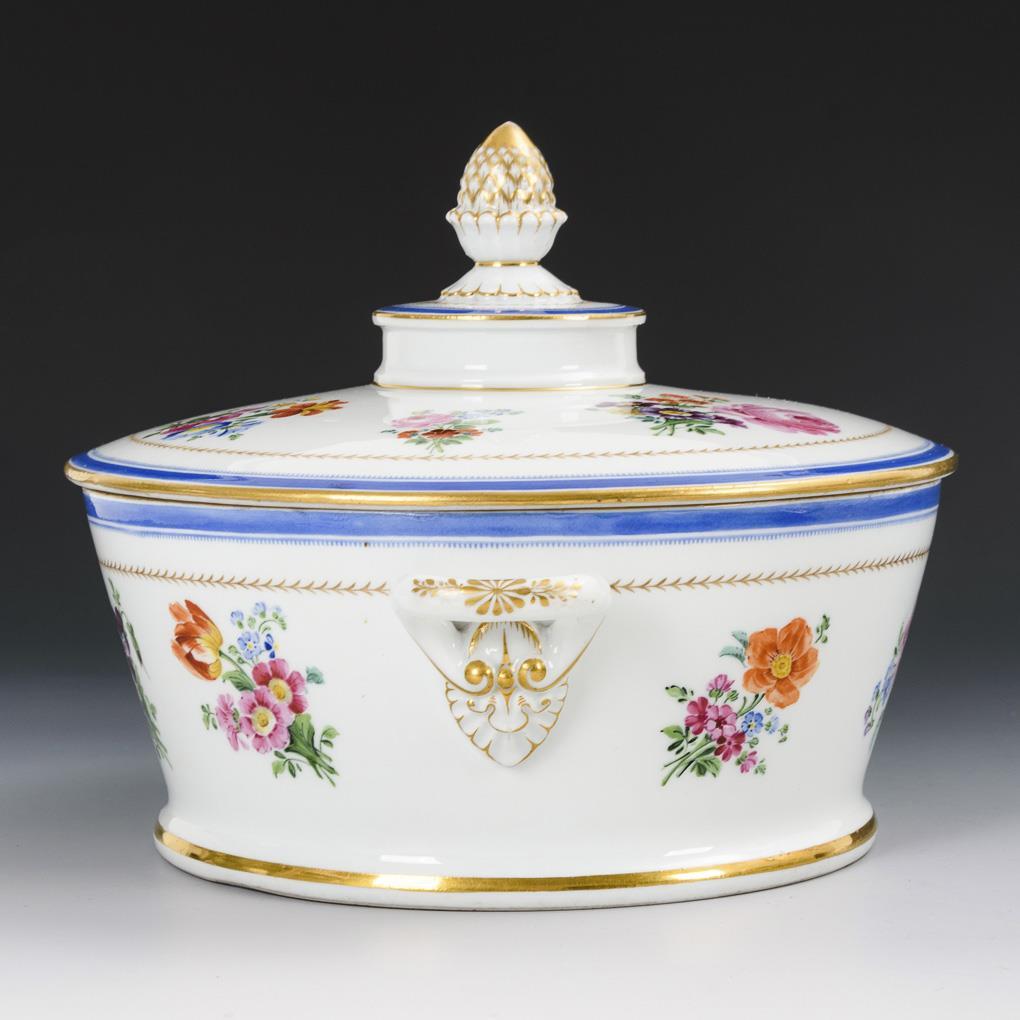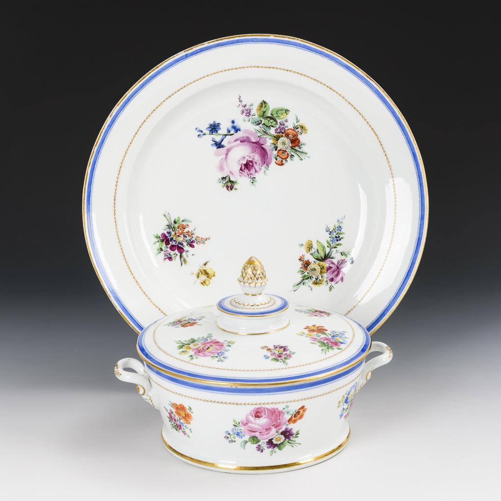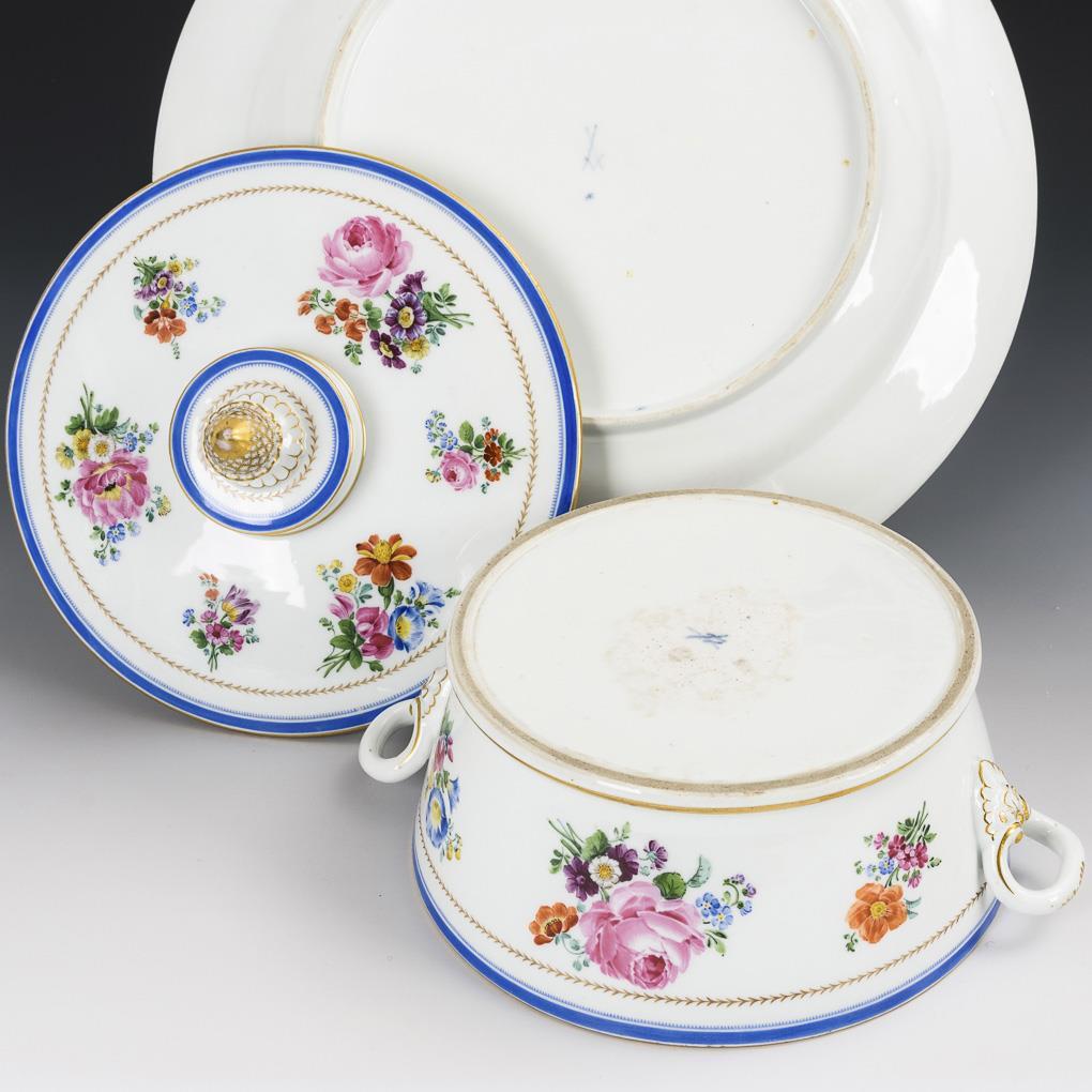 Blau-goldener Rand und polychrome, fein gemalte Blumenbuketts, Goldstaffage. Deckelschüssel H 17 cm, Gemüseteller Ø 34 cm.