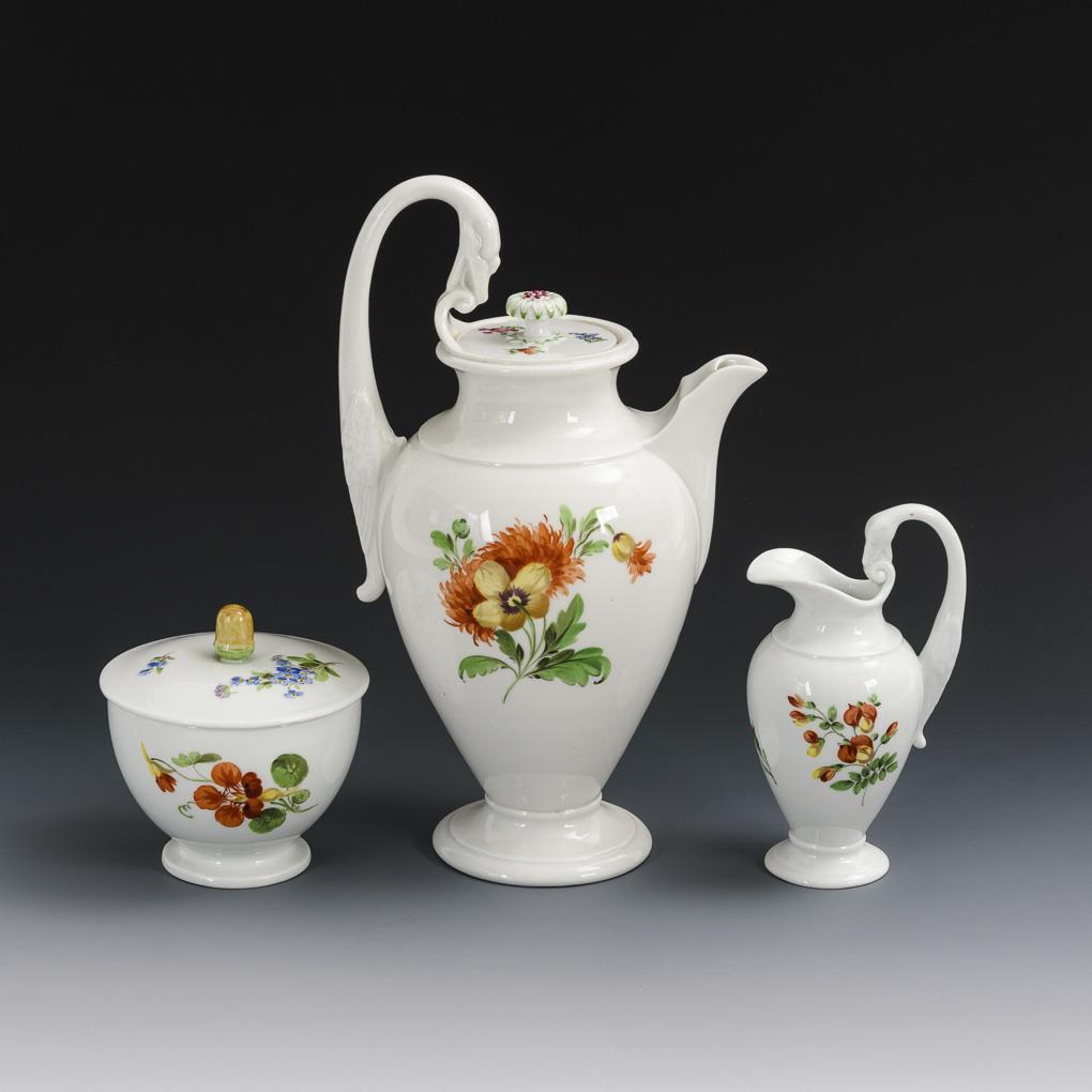 21 Teile. Kaffeekanne (H 30 cm), Milchkännchen (H 16,5 cm) und Zuckerdose (H 11 cm) in ovoider Empire-Form, 6 Tassen, 6 Untertassen und 6 Kuchenteller in der Form "Neuer Ausschnitt". Bestoßung an 1 Tassenrand und 1 Untertassenrand.