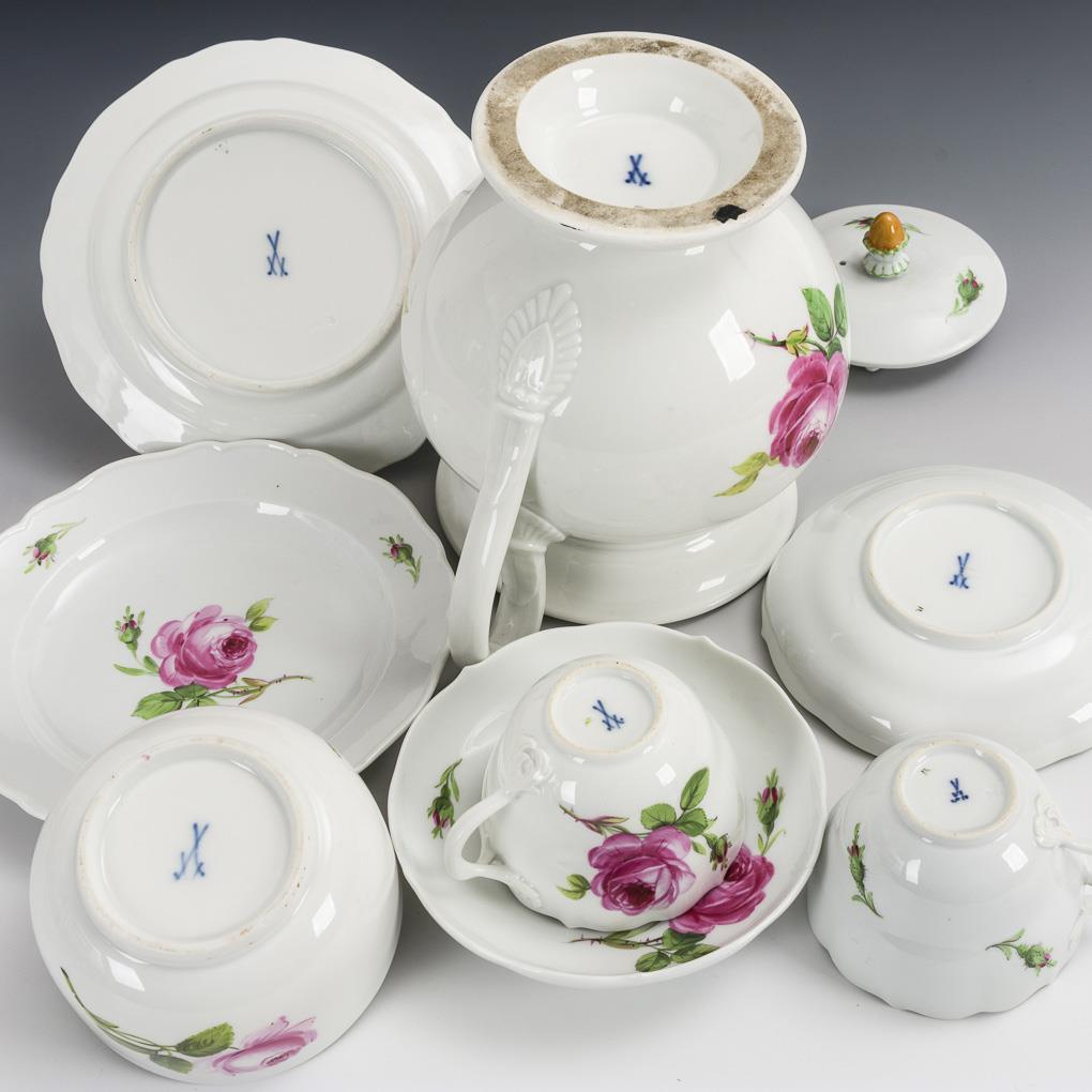2 Gedecke, Kanne und Zuckerdose "Rote Rose". Meissen.