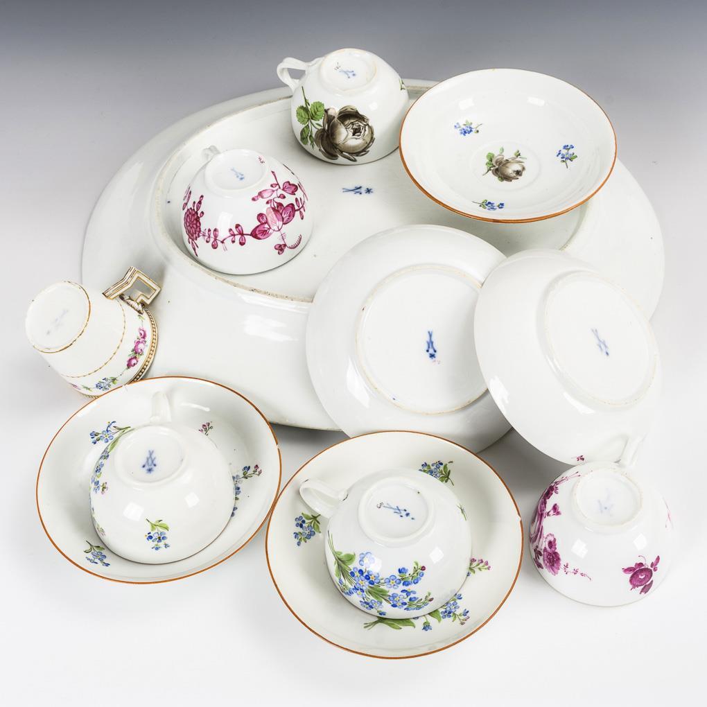 Ovalplatte mit Kakiemonmalerei (L 38 cm), 2 Tassen und Untertassen mit Vergißmeinnichtsträußchen, 1 Tasse und Untertasse mit schwarzer Rose und Vergißmeinnicht, 1 Tasse und Untertasse mit purpurfarbener Blumenmalerei, 1 Tasse und Untertasse mit purpurfarbener, indianischer Blumenmalerei sowie 1 Tasse Rosen- und Vergißmeinnichtbordüre. Teils berieben, Platte etwas verzogen und mit 1 Randbestoßung, 2 Untertassenränder bestoßen, 1 Tassenstandring bestoßen, Haarriss in 1 Henkel.