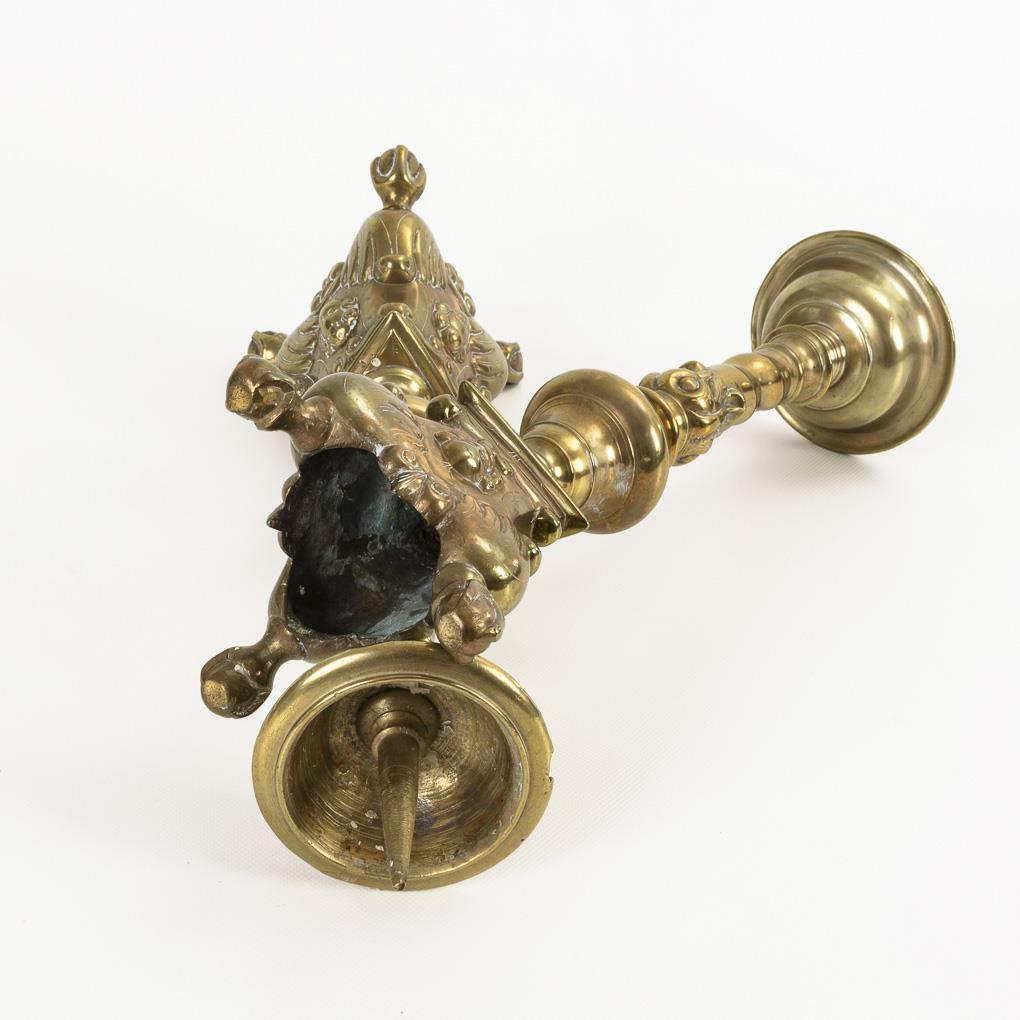 Dreipassiger Sockel mit Klauen-Kugel-Füßen und Engelsköpfen. Über dem Baluster der Blattansatz für den tordierten Schaft sowie Wachsschale mit Bronzedorn. 1 Fuß und 1 Baluster repariert, 1 kleiner Ausbruch am Wachsteller, sonst wenige Alters-/Gebrauchsspuren.