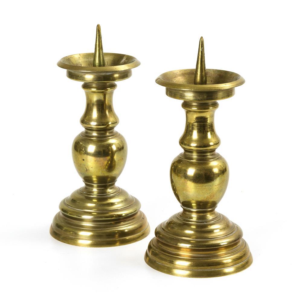 Massive Bronzeleuchter in gedrungener Balusterform. Verbindung Bronzedorne nachgelötet.