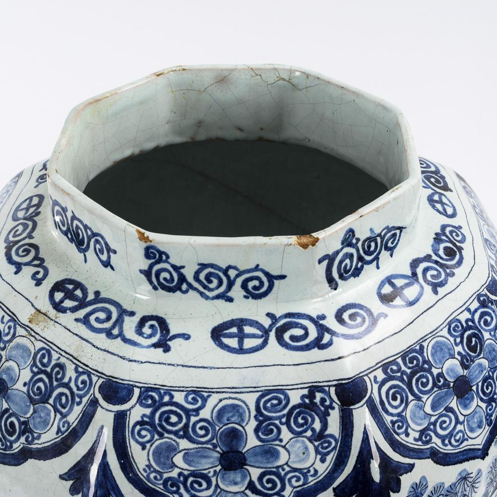 Balusterform mit achtfach geplatteter Wandung, abgesetztem Hals und hohem Stand. Ohne Deckel. Umlaufend asiatisierende Figurengruppen in exotischer Landschaft. Unterseitig ein Brandriss, partiell leicht bestoßen und haarrissig.