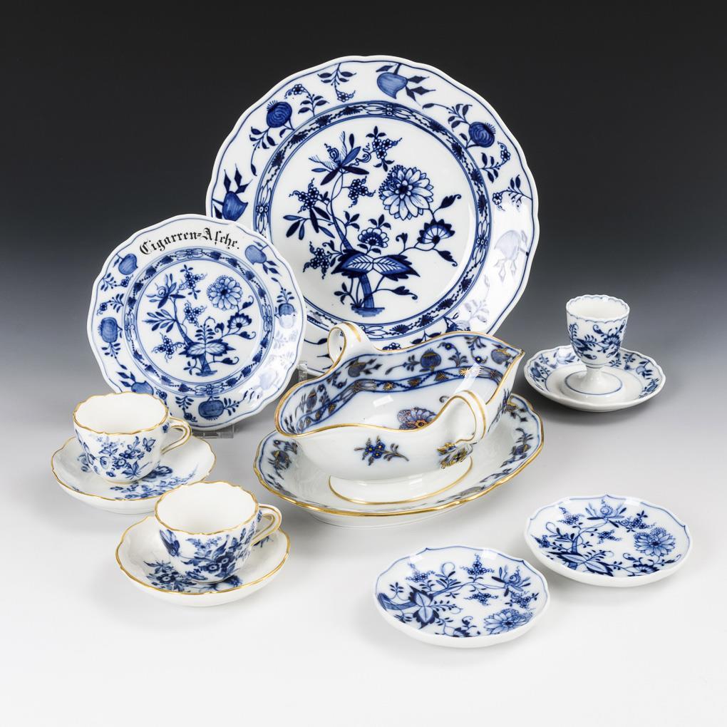 Sauciere (L 22 cm), Speiseteller, Teller "Cigarren-Asche (Ø 15,5 cm), 2 Mokkatassen mit 2 Untertassen, 1 Eierbecher und 2 Schälchen. Chip am Rand des "Cigarren"-Tellers, Bestoßung am Eierbecherrand.