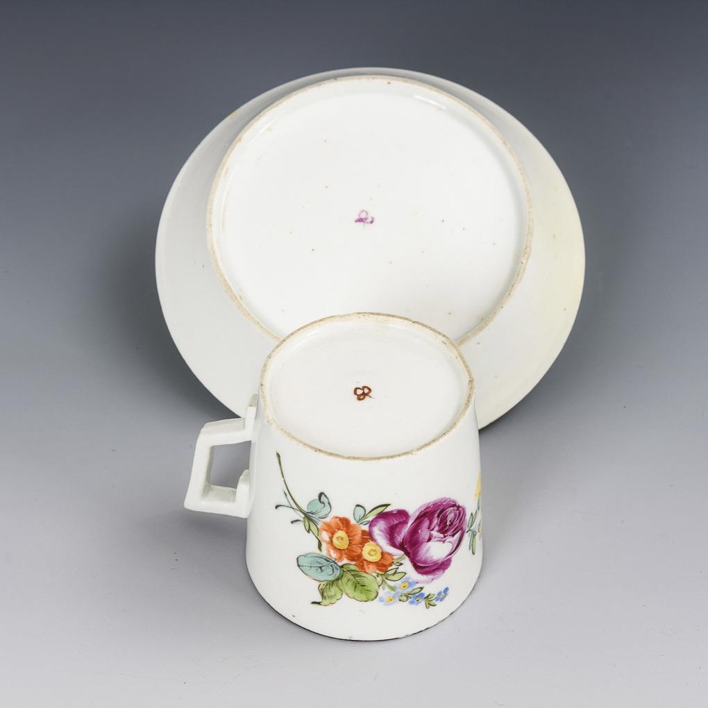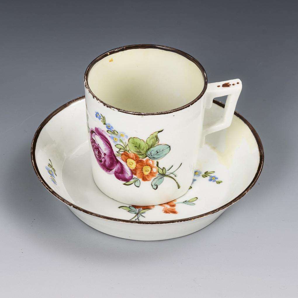 Leicht konische Tasse mit gewinkeltem Henkel. Tassen- und Untertassenrand restauriert.