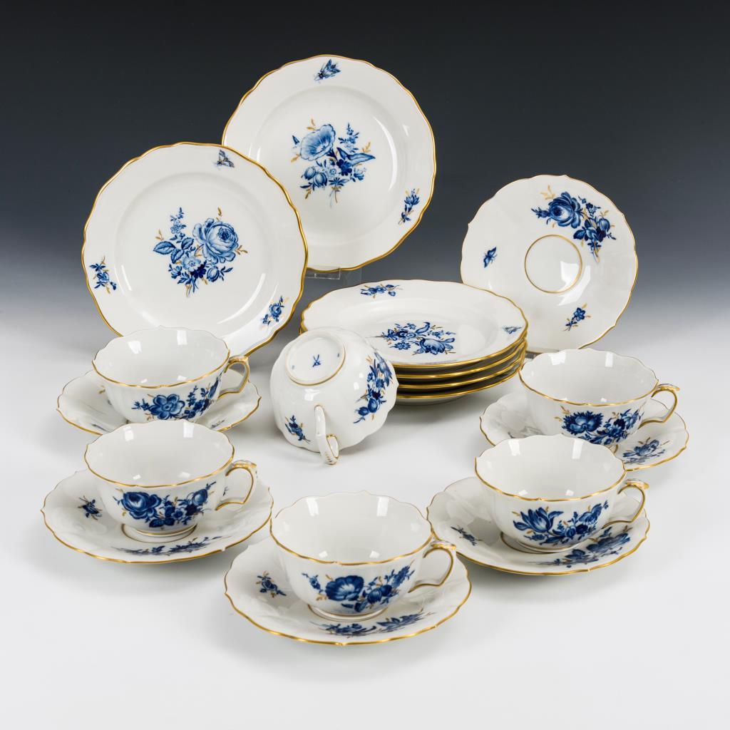 Unterglasurblaue Blumenmalerei, Goldstaffage.6 Teetassen H 5,5 cm, 6 Untertassen Durchmesser 15,5 cm, 6 Kuchenteller Durchmesser 18,5 cm.