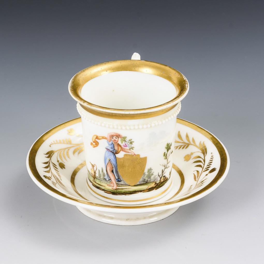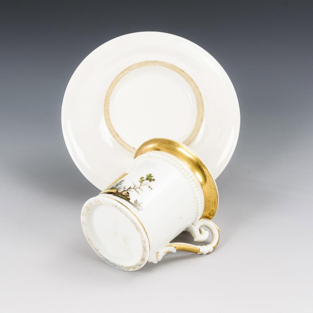 Kratertasse mit Perlband, Maskaronhenkel und ergänzter Untertasse. Schauseitig auf der Tasse die polychrom gemalte Darstellung einer Landschaftsinsel mit einer antik gekleideten, ein goldenes Schild haltenden jungen Frau, auf dem Schild das radierte Monogramm "ASA 1844". Restaurierung am Mündungsrand, minimaler Goldabrieb.