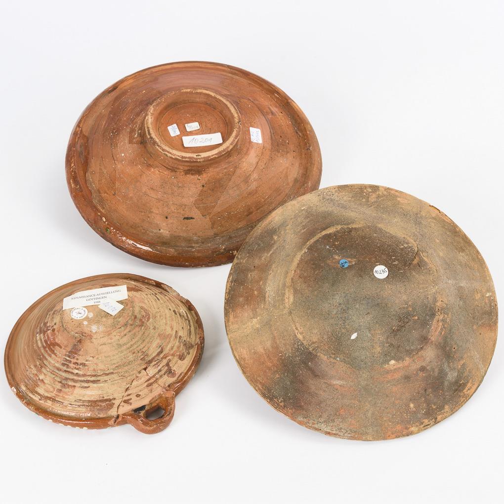 Runde Schalen mit Liniendekor, Wellen (Ø 26,5 cm), Rosette (Ø 23 cm) und Hasenmotiv, verso Etikett "Renaissance Ausstellung Göttingen 1988" (Ø 17,5 cm). Mit Defekten und Reparaturen, Alters- und Gebrauchsspuren.