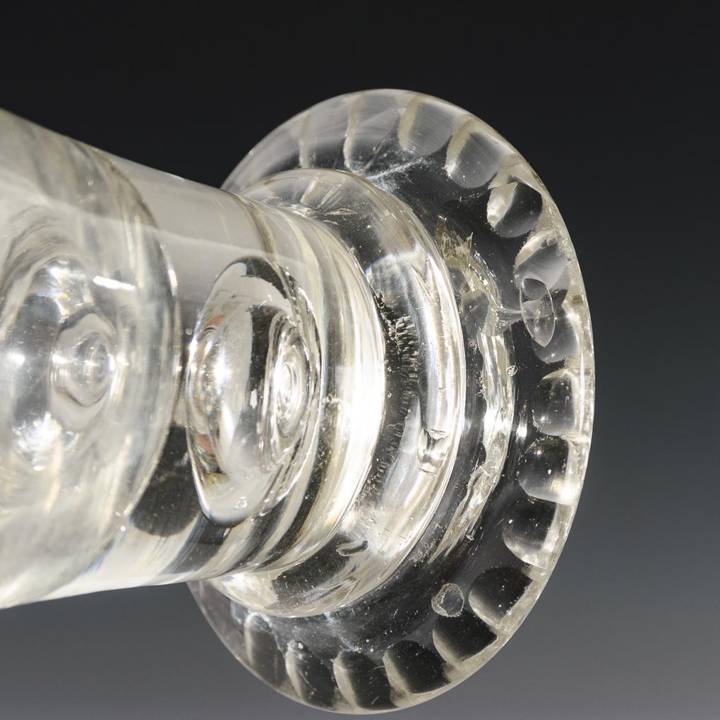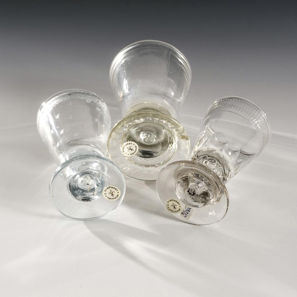 Gläser mit konischer, in den massiven Hohlschaft bzw. Schaft mit eingestochener Luftblase übergehender Kuppa, darunter 1x mit Stecknadelblumenbordüre und Flächenschliff (wohl Lauenstein) und 1x mit gravierten Sternchen. 2x Bestoßung am Fußrand.