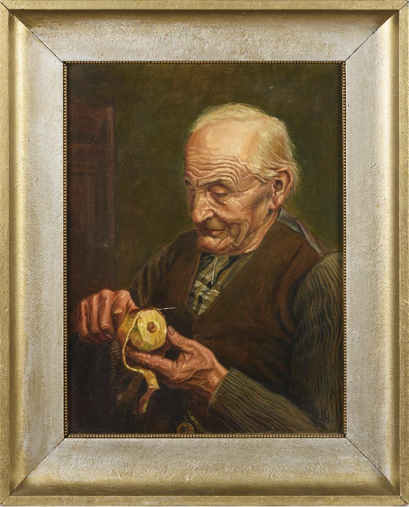 Bildnis eines alten Mannes beim Schälen des Apfels. Eine kleine restaurierte Stelle mit Hinterklebung.