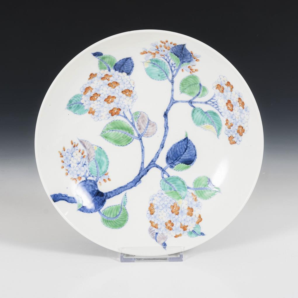Flache Schale mit Fußkranz, im Spiegel qualitätvoll gemalter Hortensienzweig mit hellen Blüten. Auf der Unterseite blaue Ranken und alte Inventarnummer "Z(?) 3249" in roter Farbe.