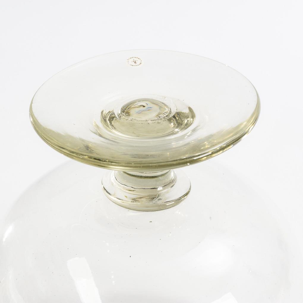 Farbloses, leicht blasiges Glas, am Rand aufgeschmolzener blauer Faden, Abriss. H 26,5 cm.
