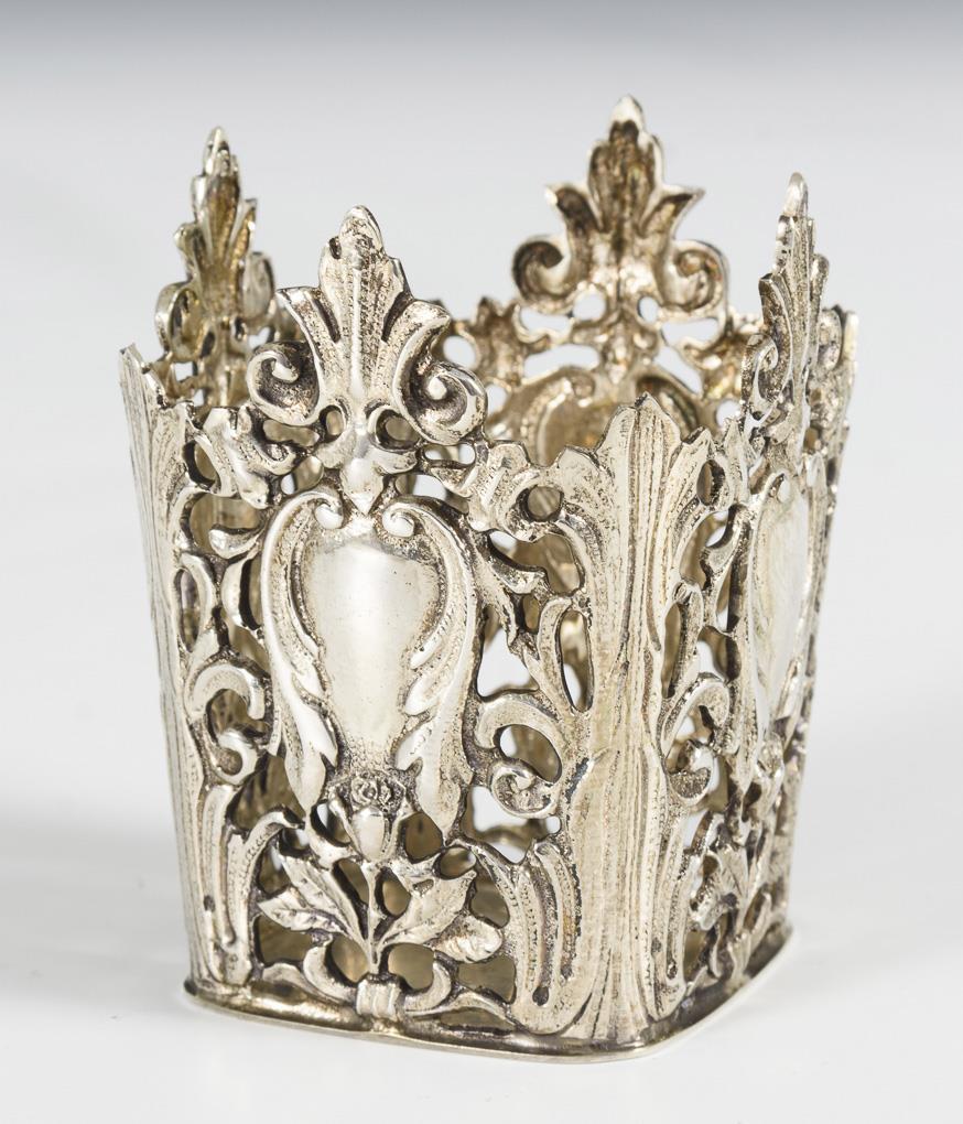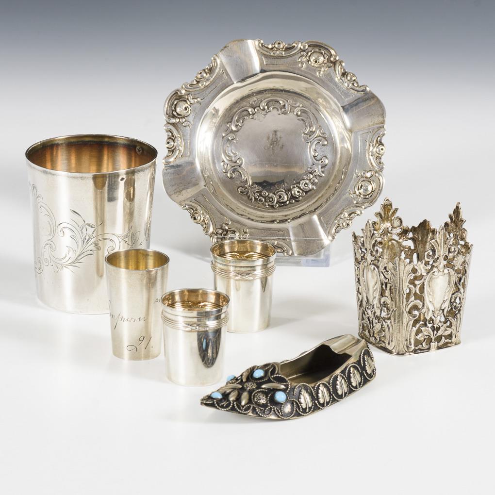 4 verschiedene Becher, 2 Ascher und 1 durchbrochener Halter. Leichte Gebrauchsspuren.