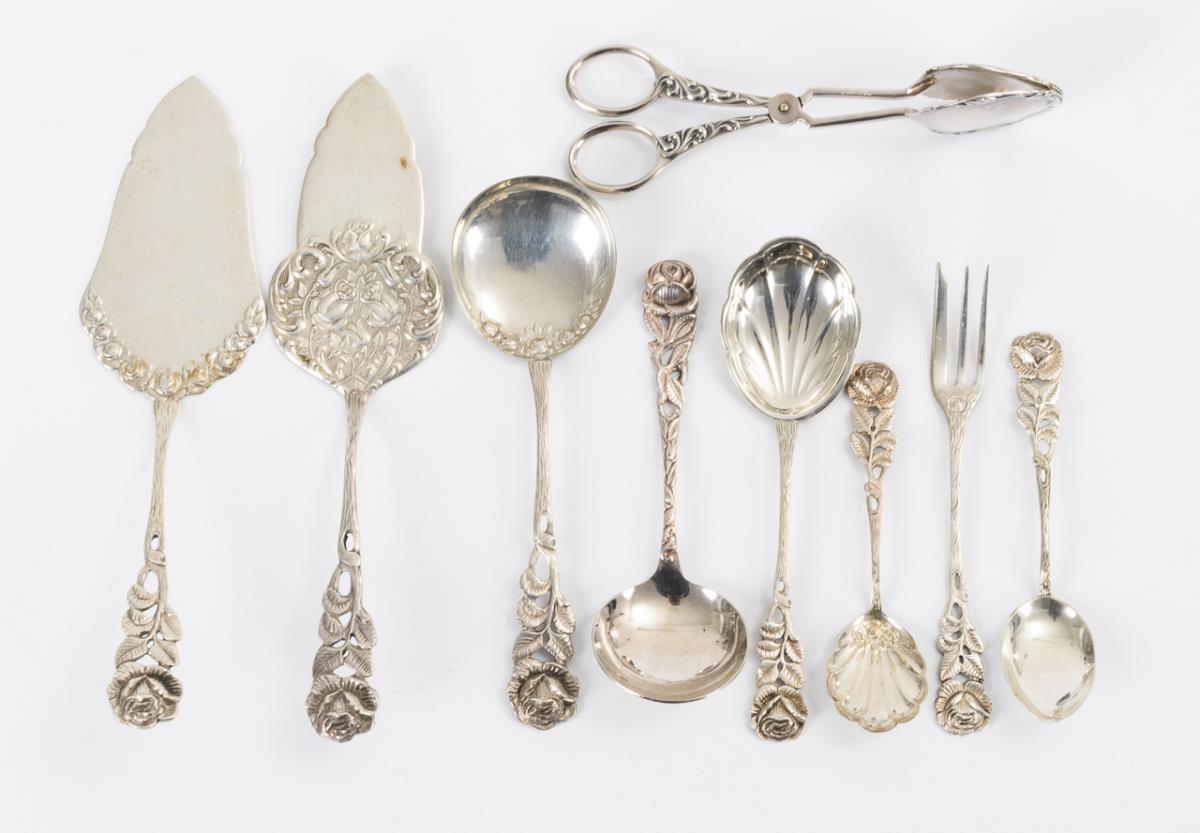 33 Teile: 14 Kuchengabeln, 12 Kaffeelöffel, 3 Sahnelöffel, 2 Tortenheber, 1 Gebäckzange und 1 Zuckerlöffel. In 2 Originalschatullen.